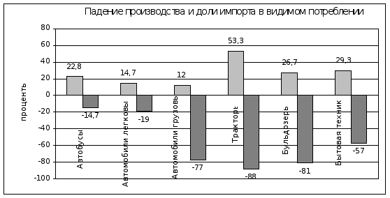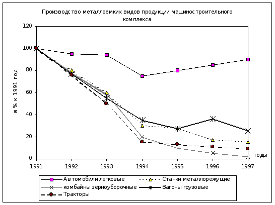 Только одно автомобильное машиностроение держится на относительно высоком уровне, и падение составило порядка 11% по сравнению с 1991 г. Капитальное строительство. Соотношение промышленного и непромышленного строительства. Непромышленное строительство растет, металлоемкость там в 1.8 раза ниже. Ввод основных промышленных объектов. За последние 7 лет, кроме металлургии, в РФ не было ввода крупных промышленных объектов. В перспективе ожидается ввод нескольких объектов. Это и трубопровод Ямал-Европа, морские основания нефтегазовых платформ Сахалин 1 и Сахалин 2 в Баренцевом море, строительство автомобильных заводов, которые пока работают на отверточной технологии, но постепенно будут переходить на технологию отечественного производства почти всех деталей и развитие прочих отраслей. По конкретным изменениям всех этих показателей видим, что в 1997 г. валовый внутренний продукт составил 50% с небольшим, валовая продукция промышленности — 61%, капитальное строительство — 27% от уровня 1991 г. а металлопотребление упало до 30% с небольшим против уровня 1991 г. Прежде всего это падение коснулось машиностроения, потребление в котором упало более чем в 3 раза. Доля машиностроения в металлопотреблении сократилась до 43%. Изменилось производство металлоемких видов продукции. В 1997 г. производство комбайнов упало почти до 1% с небольшим к уровню 1991 г., производство тракторов упало до 7%, и только производство легковых автомобилей сохранилось на уровне 89%. Ко всему этому в товарообороте большой объем занимают металлоемкие виды импортной продукции. Вот конкретный пример. Производство автобусов упало на 23% 22% составляет импорт этих автобусов. Резко упало производство тракторов на 88% —53.3%