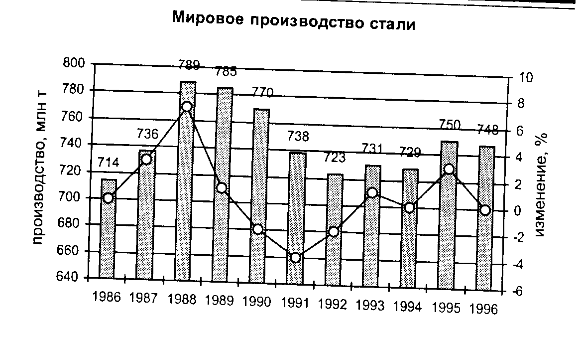 В перспективе в некоторой мере изменится и структура металлопотребления. Она будет приближаться к структуре мировой, а именно: доля листового проката в 2005 г. превысит 50% против 42% в 1991 г. Не следует ожидать больших изменений регионального спроса на металлопродукцию, больший подъем будет наблюдаться там, где было большее падение, т.е. в Центральной Европейской части страны и на Дальнем Востоке. Условиями расширения внутреннего металлопотребления являются стимулирование отечественных машиностроителей, развитие бытовых и сервисных услуг, ограничение роста цен на металлопродукцию и протекционистская политика защиты отечественных производителей. Необходим более качественный менеджмент, поскольку эра массового, безликого производства продукции рядового качества прошла, и для удержания, а тем более завоевания новых рынков нужна тонкая маркетинговая политика, способная удовлетворить все более индивидуализированные потребности по разумным ценам. Металлургия, как бы она не улучшала качество и параметры своей продукции, не сможет их реализовать, если к этому не будут подготовлены отечественные потребители. Проведем анализ современного состояния мирового рынка и металлургического комплекса России. На диаграмме показано изменение мирового производства и потребления стальной продукции в период с 1986 по 1996 гг. Это достаточно длительный период для такой отрасли, как металлургия. Показатель производства колеблется, наибольший спад наблюдаем в 1991 году, колебания объема производства повторяют колебания потребления. Можно сделать следующие выводы. 1991 г. — начало 1 кризиса в странах Восточной Европы и в республиках бывшего СССР.