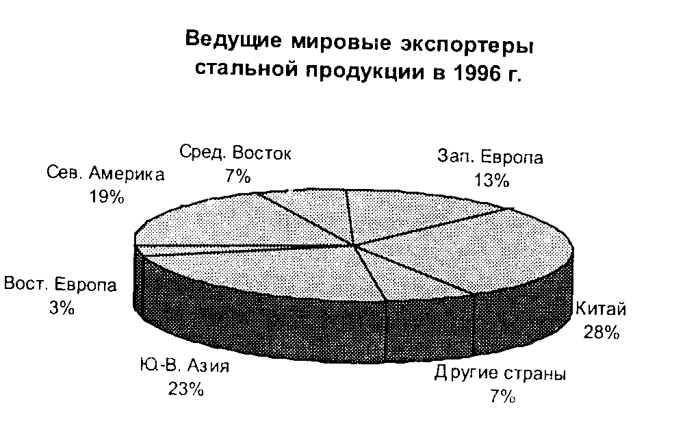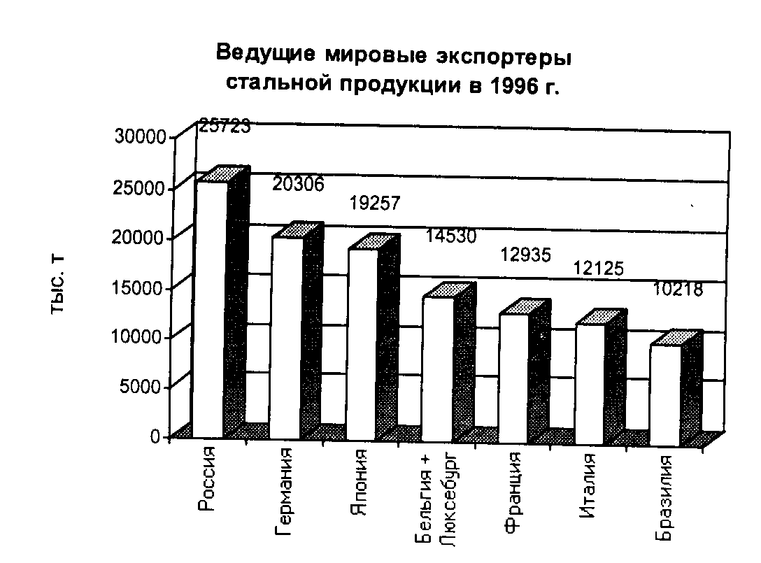 Мировое потребление после этого провала восстанавливается и растет, и тенденция роста в пределах 23% наблюдается и в настоящее время. Те же тенденции в производстве стальной продукции наблюдаются и во всем мире, кроме стран Содружества и стран Восточной Европы. Если говорить о России, то в прошлом году, к сожалению, произошло снижение по сравнению с 1995 г., который с вами отмечали как год роста после кризиса 19911994 гг. Однако в 1996 г. произошел очередной спад на 4,2%, и объем производства составили: сырой стали порядка 49 млн т, проката — около 40 млн т. К сожалению, наиболее резко снижались и продолжают снижаться объе производства стального проката в России. В 1996 г. объем производства российского и импортного проката вместе составили около 16.6 млн т, что почти в 2 раза меньше, чем в 1993 г., и в 3 с лишним раза меньше, чем в 1991 г. Глубочайший кризис внутреннего рынка заставил российских производителей искать свое место и меры спасения. Нельзя не сказать о том, что душевое потребление стальной продукции сегодня уже менее 130 кг на одного россиянина это очень и очень впечатляющий и тревожный факт. Это свидетельство глубочайшего промышленного кризиса промышленности России. Сегодня по этому показателю, не говоря уже о развитых странах, находимся на уровне развивающихся стран, где-то уже во второй половине списка. В конце 80х годов настойчиво внедрялась мысль о том, что слишком много производим стальной продукции, слишком много производим чугуна и стали. Но на самом деле все еще производится приличное количество, но потребляем недопустимо мало. И это сегодня основная забота производителей стальной продукции. Глубочайший кризис заставил российских производителей искать сбыт своей продукции на мировых рынках. По статистическим данным, Россия в 1996 г. вышла на первое место в мире среди экспортеров стальной продукции.