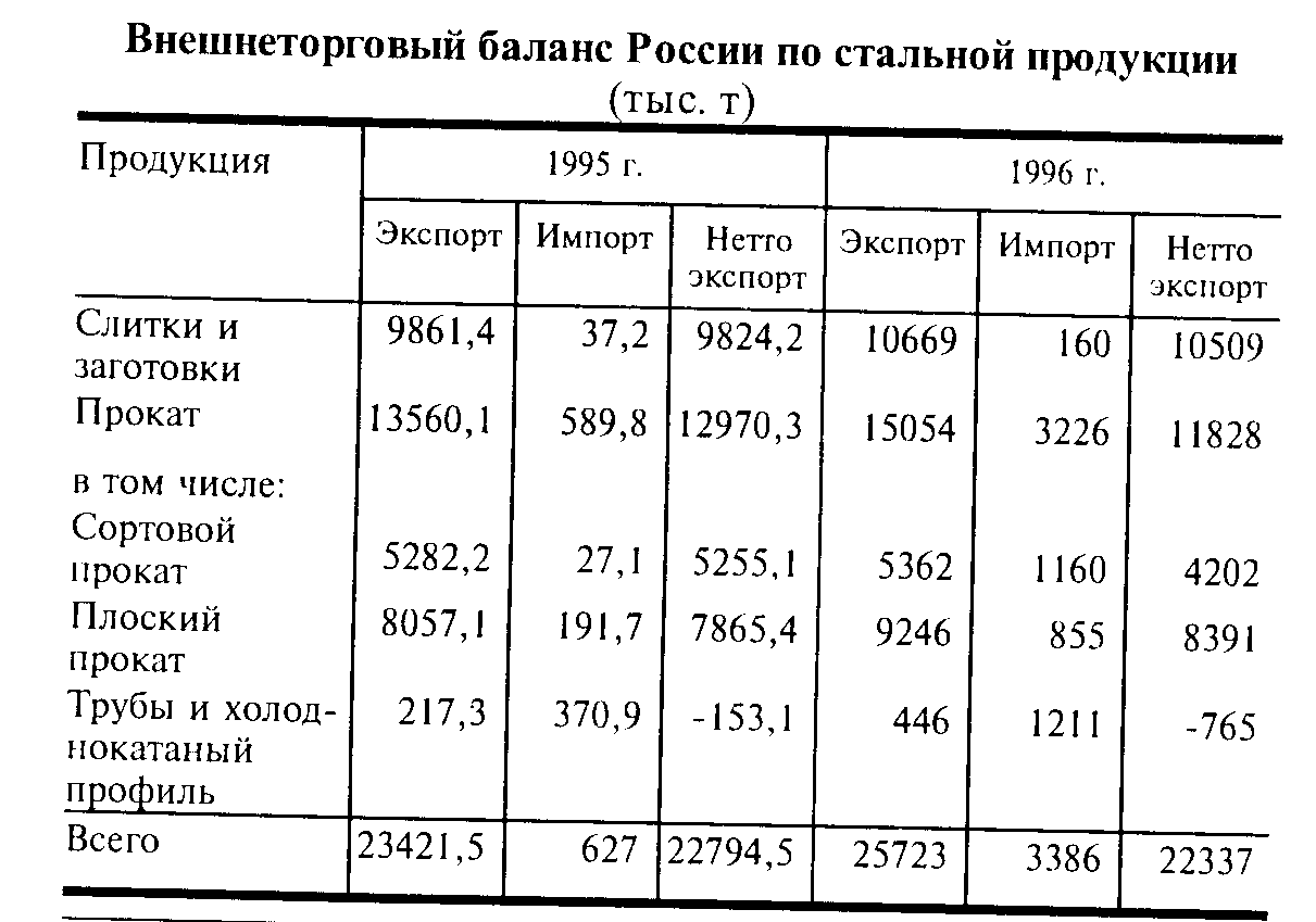Проанализировав диаграмму, видно, что Россия поставила на мировые рынки 25.7 млн т стальной продукции, за нами идут Германия, Япония, потом Бельгия. Франция. Стоимость экспорта черных металлов в 1996 г. составила 7.5 млрд долл. и превысила показатель 1995 г. почти на 6%. Структура российского экспорта стальной продукции за 1995-1996 гг. и торговый баланс показаны на соответствующих таблицах. Их можно прокомментировать следующим образом. 2/3 составляет прокат. Структура российского экспорта стальной продукции в 1995-1996 гг.