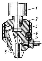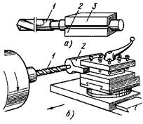 заднего центров станка. Заготовку устанавливают в патрон и проверяют, чтобы ее биение (эксцентричность) относительно оси вращения не превышала припуска, снимаемого при наружном обтачивании. Проверяют биение торца заготовки, в котором будет обрабатываться отверстие, и выверяют заготовки по торцу. Перпендикулярность торца к оси вращения заготовки можно обеспечить подрезкой торца, при этом в центре заготовки можно выполнить углубление для нужного направления сверла и предотвращения его увода и поломки. Сверла с коническими хвостовиками устанавливают непосредственно в конусное отверстие пиноли задней бабки, а если размеры конусов не совпадают, то используют переходные втулки. Для крепления сверл с цилиндрическими хвостовиками (диаметром до 16 мм) применяют сверлильные кулачковые патроны (рисунок справа, ниже), которые устанавливаются в пиноли задней бабки. Сверло закрепляется кулачками 6, которые могут сводиться и разводиться, перемещаясь в пазах корпуса 2. На концах кулачков выполнены рейки, которые находятся в зацеплении с резьбой на внутренней поверхности кольца 4. От ключа 5, через коническую передачу приводится во вращение втулка 3 с кольцом 4, по резьбе которого кулачки 6 перемещаются вверх или вниз и одновременно в радиальном направлении. Для установки в пиноли задней бабки патроны снабжаются коническими хвостовиками 1. Перед сверлением отверстий заднюю бабку перемещают по станине на такое расстояние от обрабатываемой заготовки, чтобы сверление можно было производить на требуемую глубину при минимальном выдвижении пиноли из корпуса задней бабки. Перед началом сверления обрабатываемая заготовка приводится во вращение. Сверло плавно (без удара) подводят вручную (вращением маховика задней бабки) к торцу заготовки и производят сверление на небольшую глубину (надсверливают). Затем отводят инструмент, останавливают заготовку и проверяют точ