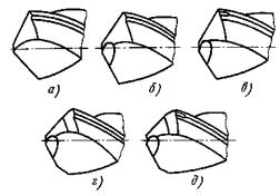 Для повышения эффективности работы спиральными сверлами используют такие способы, как подточка поперечной кромки, изменение угла при вершине, подточка ленточки, двойная заточка, предварительное рассверливание отверстий и др. Стандартные сверла имеют угол при вершине 118 градусов, однако для обработки более твердых материалов (и более глубоких отверстий) рекомендуется применять сверла с углом при вершине 135 градусов. Формы заточки режущей части сверла: а) - нормальная, б) - нормальная с подточкой перемычки, в) - нормальная с подточкой перемычки и ленточки, г) - двойная с подточкой перемычки, д) - двойная с подточкой перемычки и ленточки. Рассверливание позволяет