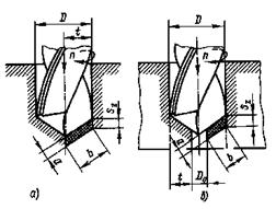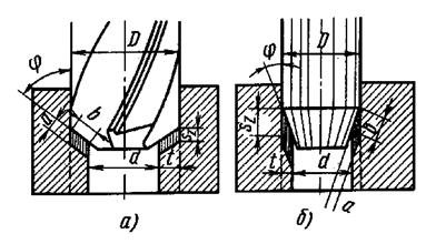 1 - режущая кромка, 2 - передняя поверхность, 3 - задняя поверхность, 4 - поперечная кромка, 5 - канавка, 6 - ленточка Для сверления дерева, ДСП, мягких и твердых пластиков и металлов подойдет обыкновенное сверло из высокопрочной стали. Для камня, кирпича или бетона - твердосплавное сверло. У таких сверл на наконечнике напаяны пластины из твердых (тверже бетона и камня) сплавов. В качестве такового обычно используется победит - отсюда и название "победитовые сверла". Победитовые сверла материал не режут, а крошат, поэтому для сверления стены подходят идеально, но для работы по дереву, пластику или стали не годятся. Такие сверла не режут дерево, а рвут его волокна - отверстие получается "лохматым", некрасивым и имеет больший диаметр, чем надо. Для более твердых материалов (например, гранит) используются сверла с твердыми или средней твердости победитовыми пластинами, а для более мягких материалов (кирпич, мягкий бетон и т.п.) можно использовать сверла с мягкими или средней мягкости пластинами. Обработка отверстийЗенкерование. Зенкером обрабатывают отверстия, предварительно штампованные, литые или просверленные. Рисунок - а). Припуск под Зенкерование (после сверления) составляет 0,5-3 мм на сторону. Зенкер выбирают в зависимости от обрабатываемого материала, вида (сквозное, ступенчатое, глухое) и диаметра отверстия и заданной точности обработки. Зенкер имеет три и более режущие кромки, поэтому при зенкеровании снимается более тонкая стружка и получаются более точные отверстия, чем при сверлении; он прочнее сверла, благодаря чему подача при зенкеровании в 2,5-3 раза превышает подачу при сверлении. Зенкерование может быть как предварительной (перед развертыванием), так и окончательной операцией. Кроме обработки отверстий зенкеры применяются для обработки торцовых поверхностей. Для повышения точности зенкерования (особенно при обработке литых или штампованных глубоких отверстий) рекомендуется предварительно расточить (резцом) отверстие до диаметра, равного диаметру зенкера на глубину, примерно равную половине длины рабочей части зенкера. Для обработки высокопрочных материалов (>750 МПа) применяют зенкеры, оснащенные пластинами из твердого сплава. Скорость резания для зенкеров из быстрорежущей стали такая же, как и для сверл. Скорость резания твердосплавных зенкеров в 2-3 раза больше, чем зенкеров из быстрорежущей стали. При обработке высокопрочных материалов и литья по корке скорость резания твердосплавных зенкеров следует уменьшать на 20-30%.