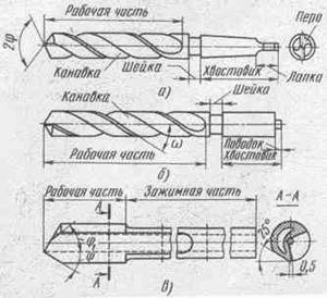сверлении отверстий большого диаметра (свыше 25-30 мм) усилие подачи может ока Сверление является одним из распространенных методов предварительной обработки отверстий на токарных станках. В зависимости от конструкции и назначения различают сверла: спиральные, перовые, для глубокого сверления, центровочные, эжекторные и др. Наибольшее распространение получили спиральные сверла (На рисунке сверла: а - спиральное с коническим хвостовиком, б - спиральное с цилиндрическим хвостовиком, в - для
