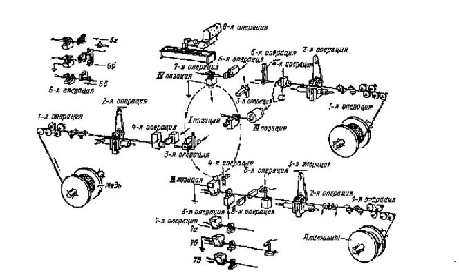 Рис. 3.2 Технологический процесс электросварки вводов Барабан, поворачиваясь на 90 0, переносит медное звено в позицию II сварки с платинитом (зона нижней сварки). К этой позиции подаётся отрихтованный (операция 1) и просушенный в электроспирали подогрева (операция 2) платинит, установленный на линии сварки с помощью направляющей вилки (операция 4) и центрального зажима (операция 5); одновременно просекатель, электрически соединённый с конденсаторами, прижимается к платиниту (операция 6), просекая слой буры. На позиции II резким перемещением производится сближение концов меди и платинита. Между ними возникает электрический разряд, сваривающий эти два звена (операция 7). После отрезки платинита на заданную длину (операция 8) и отвода платинита назад (для увеличения зазора в месте резки) следует второй поворот барабана на 900. В позиции III специальной оправкой звено палтинита подгибается к оси вращения позиционного барабана для облегчения его центровки в позиции IV. После третьего поворота барабана платинит, сваренный с медью, устанавливается в позиции IV сварки с никелем (зона верхней сварки) Отрихтованная никелевая проволока (операция 1) подаётся (операция 2) к этой позиции и после центровки (операция 3) зажимается в рычаге-державке никеля и отрезается на заданную длину (операция 4) с последующим отводом отрезанного звена от ножа на 0,8 – 1,0 мм. Резким движением рычага-державки в сторону позиционного барабана (операция 6) сближаются концы платинита и никеля, между ними возникает электрический разряд, производящий сварку. Перед четвёртым поворотом губки корпуса открываются (операция 7) и готовой ввод захватывается съёмником (операция 8), сбрасывающим его в лодочку, установленную перед барабаном. Таким образом, за полный оборот барабана получаются четыре готовых ввода. Автомат имеет производительность 105-130 шт/мин и рассчитан на изготовление электродов диаметром никелевого звена до 1,2 мм, медного – до 0,6 м , платинитового – до 0,5 мм и длиной одного из звеньев не более 75 мм. 3.3 Изготовление крючков Молибден принадлежит к числу редких тугоплавких металлов. Отечественная промышленность выпускает молибденовую проволоку 1 и 2 классов. Проволоку класса 2 с допуском на вес отрезка 3% применяют для изготовления держателей тела накала, впаев в тугоплавкое стекло и нагревательных элементов высокотемпературных электрических печей. На предприятиях металлургической промышленности обогащённую руду обжигают в пламенных печах с одновременной подачей воздуха. Полученный продукт – молибденовый ангидрид, очищают от примесей. Сначала заготовительный элемент просеивают, сушат в сушильном шкафу и снова просеивают. Полученный однородный по зернистости сухой порошок прокаливают при 500 0С в электрической печи. Очищенный просеянный зеленоватый порошок молибденового ангидрида восстанавливают водородом в трубчатых печах с передвигающимися лодками. Восстановленный порошок молибдена просеивают через сито, перемешивают в смесителе, увлажняют смесью глицерина и спирта и прессуют. Прессованные штабики подвергают операциям предварительного спекания при 1100-1200 0С и окончательного спекания в одну стадию при токе, равном 90 % тока переплавки. Спекание в вакууме позволяет получить более пластичный и однородный по структуре и механическим свойствам металл. Ковку моли