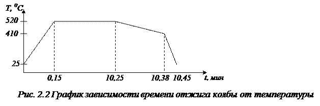 t = t1 + t2 + t3 + t4 , (2.8) t = 0.15 + 10.1+0.13+0.07; t = 10.45 мин На основании этих данных построим график зависимости времени отжига колбы от температуры (рис. 2.2)