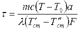 где: l - коэффициент теплопроводности, кал*с-1*К-1*см-1; Тст’ – температура внешней поверхности стенки, 0С; Тст’’ – температура внутренней поверхности изделия, 0С; а – толщина стенки изделия, см. 3) количество теплоты, необходимое для нагрева изделия: Qт = m*c*( T – T0 ), (2.11) где: m – масса нагреваемого стекла, г; с – удельная теплоёмкость, кал*г-1*К-1; Т – температура до которой необходимо нагреть изделие, 0С; Т0 – температура окружающей среды, 0С. 3) Количество теплоты, которое подходит к внутренней поверхности стекла должно быть равно количеству, необходимому для нагрева: Qт = Q’ (2.12) Из уравнения (2.12) можно найти время заварки: