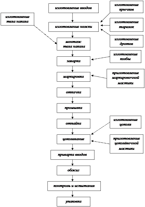 Содержание Введение 5 1. Конструкторская часть 6 2. Расчётная часть 8 2.1 Расчёт времени отжига 8 2.2 Расчёт времени заварки лампы 10 3. Технологическая часть 13 3.1 Схема технологического процесса 13 3.2 Изготовление вводов 14 3.3 Изготовление крючков 17 3.4 Изготовление тарелок 19 3.5 Изготовление дротов 20 3.6 Изготовление ножки 22 3.7 Изготовление тела накала 27 3.8 Монтаж тела накала 31 3.9 Изготовление колбы 33 3.10 Заварка 34 3.11 Приготовление маркировочной мастики 35 3.12 Маркировка 36 3.13 Откачка 37 3.14 Промывка 38 3.15 Отпайка 39 3.16 Изготовление цоколя 40 3.17 Приготовление цоколёвочной мастики 43 3.18 Цоколевание 44 3.19 Приварка вводов 45 3.20 Обжиг 46 3.21 Контроль и испытания 48 3.22 Технологическая выдержка и упаковка 49 Заключение 51 Список использованных источников 52 РЕФЕРАТ Пояснительная записка содержит: 52 страницы, 8 рисунков, 1 таблицу, 9 использованных источников Ключевые слова: ввод, дрот, заварка, крючки, колба, лампа накаливания, маркировка, мастика, откачка, отпайка, тарелка, тело накала, цоколь Объект разработки: лампа накаливания В 220-25 Цель разработки: разработка технологического процесса изготовления лампы накаливания общего назначения В 220-25 Методы проведения работы: изучение и анализ учебной литературы, расчётно- графический Полученные результаты: разработан технологический процесс изготовления лампы накаливания общего назначения В 220 – 25, получены необходимые данные для проведения заварки лампы и отжига колбы Степень внедрения: широкого применения Рекомендации по внедрению: использование лампы в декоративных целях Экономическая эффективность работы: повышение качества знаний по данной теме Область применения: светотехническая промышленность Введение. Люди давно узнали, что при сильном нагреве предмет излучает свет. Этот принцип лёг в основу работы лампы накаливания. Электрический ток, проходя через тонкую нить сделал жизнь человека намного светлее. Лампа накаливания – самый распространённый в быту, на данный момент времени, источник света. Она отличается очень низкой ценой, приемлемым качеством цветопередачи и простотой установки. Сейчас в быт стали внедряться современные компактные люминесцентные лампы, которые обладают лучшими светотехническими характеристиками и потребляют намного меньше энергии, чем лампы накаливания. Однако эти лампы обладают одним существенным недостатком – большой ценой. Поэтому они не получили пока ещё такого широкого распространения. В этом курсовом проекте дано описание устройства и технологического процесса изготовления лампы накаливания общего назначения В 220 -25. Данная лампа широко используется в быту для местного освещения. В первой части курсового проекта дано краткое описание устройства лампы накаливания. Во второй части приведены расчёты основных операций производства лампы: расчёт времени отжига колбы и расчёт времени заварки лампы. Третья часть посвящена технологическому процессу изготовления, сборке и испытанию лампы. 1. Конструкторская часть В зависимости от назначений и требований предъявляемых к отдельным типам ламп накаливания их конструкция может меняться. Однако основные узлы всех типов ЛН остаются общими. 1- нижний припой; 2 – цоколь; 3 - откачная трубка (штенгель); 4 – платинитовый впай; 5 – электрод; 6 – внутреннее звено электрода (ввод); 7 – колба; 8 – вольфрамовая спираль; 9 – держатель спир