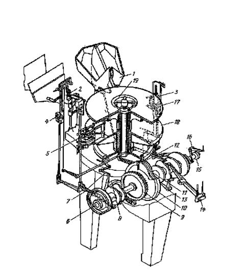 1- механизм загрузки тарелок; 2 – механизм загрузки штенгелей; 3 – механизм съёма ножек; 4 – уравнитель тарелок; 5 – клещи; 6 – распределительный вал; 7 – рычаг открывания клещей; 8 – приводной шкив; 9 – червячная передача; 10 – кулак поворота карусели; 11 – улитка; 12 – ролик для поворота карусели; 13 – рычаг отклонения горелок во время поворота карусели; 14 – рычаг привода расколоток; 15 – ролик привода цепи печи отжига; 16 – рычаг к золотнику, регулирующему продувание отверстия в ножке; 17 – верхний диск карусели; 18 – нижний диск карусели; 19 – маховик подъёма и опускания верхнего диска карусели. Рис. 3.3 Автомат сборки ножек