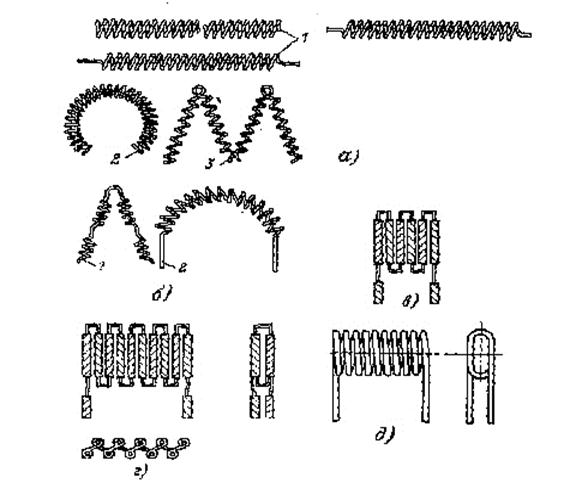 а – спирали (1 – прямолинейная, 2 – дуговая, 3 – в виде зигзага); б – секционные (двухсекционные) (1 – под углом, 2 – дужкой); в – многосекционные, формованные в одной плоскости, - «моноплан»; г – многосекционные, формованные в двух плоскостях, «биплан»; д – плоские, изготовляемые на керне в виде пластины. Рис. 3.4 Типы спиралей Вольфрамовая проволока очищается от окиснографитного слоя различными методами: отжигом в атмосфере влажного водорода, химическим травлением в растворах едких щелочей или в расплавах солей, а также электрохимическим травлением и ультразвуковой очисткой. Спирализация