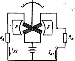 Ошибка от непостоянства напряжения питающего источника не возникает, если измерительный механизм имеет две обмотки, расположенные на общей оси под некоторым углом друг к другу (рис. 2.). Рис. 1. Рис. 2. В двухрамочном измерительном механизме, который называют логометром, нет противодействующих пружин, вращающий и противодействующий моменты создаются электромагнитными силами. Поэтому при отсутствии тока в обмотках хорошо уравновешенная подвижная часть прибора находится в безразличном равновесии (стрелка останавливается у любого деления шкалы). Когда в катушках есть ток, на подвижную часть действуют два электромагнитных момента, направленные в противоположные стороны. Магнитная цепь измерительного механизма устроена так, что магнитная индукция вдоль воздушного зазора распределена неравномерно, но с таким расчетом, что при повороте подвижной части в любую сторону вращающий момент уменьшается, а противодействующий момент увеличивается (в зависимости от направления поворота роль моментов меняется). Подвижная часть останавливается при На схеме рис. 2. видно, что измеряемое