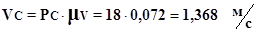 де: VВ – переносні швидкості точки С, VСВ – відносні швидкості точки С. З точки b проводимо перпендикуляр до ланки ВС і на перетині його з горизонталлю, ми отримуємо точку С і з’єднавши її з полюсом ми отримуємо графічний аналог швидкості точки С. Знаходимо дійсну швидкість точки С:
