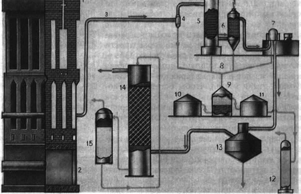 Схема коксования: 1. - коксовая батарея; 2. - сборный канал продуктов горения; 3. - газопровод; 4. - отделитель конденсата; 5. - газовый холодильник; 6. - электрофильтр; 7. - газодувка; 8. - трубопровод для отвода конденсата; 9. – отстойник; 10. – хранилище смолы; 11. – хранилище аммиачной воды; 12. – аммиачная колонна; 13. – сатуратор; 14. – бензольный скруббер; 15. – бензольная колонка. Кокс применяют для изготовления электродов, для фильтрования жидкостей и, самое главное, для восстановления железа из железных руд и концентратов в доменном процессе выплавки чугуна. В доменной печи кокс сгорает и образуется оксид углерода (IV): С + 02 = СО2 + Q, который взаимодействует с раскаленным коксом с образованием оксида углерода (II): С + СO2 = 2CO - Q Оксид углерода (II) и является восстановителем железа, причем сначала из оксида железа (III) образуется оксид железа (II, III), затем оксид железа (II) и, наконец, железо: 3Fe2O3 + CO = 2Fe3O4 + CO2 + Q Fe3O4 + CO = 3FeO + CO2 – Q FeO + CO = Fe + CO2 + Q В результате доменного процесса получают жидкий чугун-сплав железа с примесями, содержащимися в железной руде и каменноугольном коксе, - углеродом, кремнием, марганцем, фосфором и серой . Коксование возникло в XVIII в., когда истребление лесов для получения древесного угля, использовавшегося при выплавке железа, стало угрожающим и потребовалось заменить этот уголь другим топливом. В 1735 г. в Англии была проведена первая доменная плавка на коксе. В наше время 10% добываемого в мире каменного угля превращают в кокс. Коксование проводят в камерах коксовой печи, обогреваемых снаружи горящим газом. При повышении температуры в каменном угле происходят разнообразные процессы. При 2500С из него испаряется влага, выделяются СО и СО2; при 3500С уголь размягчается, переходит в тестообразное, пластическое состояние, из него выделяются углеводороды-газообразные и низкокипящие, а также азотистые и фосфористые соединения. Тяжелые уг-листые остатки спекаются при 5000С, давая полукокс. А при 7000С и выше полукокс теряет остаточные летучие вещества, главным образом водород, и превращается в кокс. Все летучие продукты поступают в газосборник, а оставшийся раскаленный кокс выталкивают в так называемый тушильный вагон, где его охлаждают (тушат) водой или инертным газом. Летучие вещества при конденсации образуют аммиачную воду и смолу. Часть неконденсирующегося газа используют для нагрева угля в камерах печи; остаток газа, аммиачная вода и смола идут на переработку. Из них получают разнообразные неорганические и органические (главным образом ароматические) соединения. Из 1 т каменного угля получают примерно 800 кг кокса, 150 кг газа и 50 кг прочих продуктов. Коксохимическое производство: Важным источником промышленного получения ароматических углеводородов наряду с переработкой нефти является коксование каменного угля. Процесс коксования можно провести в лаборатории. Если каменный уголь сильно нагревать в железной трубке без доступа воздуха, то через некоторое время можно будет наблюдать выделение газов и паров. В U-образ-ой трубке конденсируется смола, имеющая неприятный запах, и над ней вода, содержащая аммиак. Проходящие далее газы собираются в сосуде над водой. В железной трубке после опыта остается кокс. Собранный газ хорошо горит, его называют коксовым газом. Таким образом, при нагревании каменного угля без доступа воздуха образуются четыре о