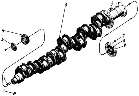 После ремонта коленчатого вала проводят следующие измерения его геометрии: диаметр шеек, их конусность и овальность; радиус кривошипа шатунных щёк; несоосность коренных шеек (размер изгиба оси вала); для валов (стальных) дизеля Д50, кроме того, определяют развал щёк и биение торцовых фланцев. В основу метода измерения несоосности коренных шеек коленчатых валов положен принцип автоколлимации при шаговом измерении ступенчатости коренных шеек по их боковым образующим со свободным провисанием коленчатого вала. Этот метод измерения используется в связи с тем, что коленчатые валы являются гибкими (вал дизеля типа Д100 при укладке на двух крайних опорах прогибается на 2 мм) и соосность (ступенчатость) их коренных шеек нельзя измерять в вертикальной плоскости. Измеряют на чугунной или бетонной плите с двумя жесткими подставками для вала в виде призм или подшипников и подставкой (штатив) для автоколлиматора. При измерениях коленчатый вал укладывают на вторую и предпоследнюю коренные шейки и таким образом создаются условия для его свободного провисания. На шейки вала поочередно устанавливают горизонтально по уровню зеркальную марку, перекрестия которой сопоставляют с перекрестиями окуляра автоколлиматора, установленного на плите. Горизонтальные ветви перекрестий совмещают вращением вертикального лимба автоколлиматора и фиксируют (записывают) его показания, по которым подсчитывают несоосность (провисание) шеек вала (смежных) и общий прогиб вала. При укладке коленчатых валов в крышки коренных опор устанавливают бесканавочные вкладыши. В блок устанавливают вкладыши прежней конструкции. При этом вкладыши устанавливают только в крышки нижнего вала, так как они не имеют отверстий для подвода масла к шейкам вала. Перед укладкой коленчатого вала подбирают по толщине вкладыши так, чтобы ступенчатость опор вала не превышала установленных норм. Затем проворачивают нижний (или верхний — при укладке нижнего) коленчатый вал до совпадения меток на зубчатых колесах вертикальной передачи. Комплект блочных (рамовых) вкладышей коренных подшипников (кроме упорного) укладывают в постели бугелей блока по клеймам. Рабочие поверхности вкладышей протирают чистой салфеткой и смазывают дизельным маслом. Вал укладывают на вкладыши так, чтобы совпали метки на зубьях колес верхней части вертикальной передачи и привода топливных насосов. Закатывают упорный подшипник, ставят крышки коренных подшипников с верхними вкладышами и закрепляют гайки коренных шпилек до совпадения меток. Проворачивая вал, устанавливают кривошипы в положения, удобные для сочленения с шатунами, и собирают шатунные подшипники. Методы и технология ремонта коленчатых валов и их подшипников дизеля Д100 При текущем ремонте ТР-1 выполняют работы, предусмотренные для ТО-3, и, кроме того, делают следующее. Замеряют щупом суммарные зазоры «на масло» в коренных подшипниках верхнего и нижнего коленчатых валов, а также зазор "в усах". Зазор "на масло" должен быть не более 0,40 мм, а зазор "в усах" — не более 0,25 мм. При больших зазорах соответствующие коренные подшипники разбирают для замены вкладышей. Проверяют провисание нижнего коленчатого вала. Для коренных шеек с 1-й по 7-ю оно не должно превышать 0,05 мм, а для 8— 10-й не должно отличаться более чем на 0,05 мм от значения, указанного в формуля