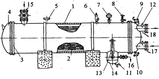 Рис.3. Они состоят из горизонтального кожуха и труб. Аммиачные горизонтальные кожухотрубные конденсаторы изготавливаются с площадью поверхности охлаждения 10-300 м2. Внутри корпуса 1 размещаются 99-870 горизонтальных стальных цельнотянутых труб, Трубы 2 ввальцованы в трубные решетки 3, приваренные к концам корпуса. Корпус с обоих сторон закрываются крышками 4 с внутренними перегородками, которые создают необходимое число ходов движения воды. Пар хладагента поступает через патрубок 15 сверху. Образующаяся жидкость стекает вниз и отводится через вентиль 16 из верхней части маслоотстойника 14. Охлаждающая вода поступает по патрубку 17 и выходит через патрубок 18. Сверху на конденсаторе устанавливаются манометр 7 и предохранительный клапан 6, а также ппуцера для присоединения уравнительной линии к ресиверу 5. Воздух и неконденсирующиеся газы следует удалять из конденсатора в месте их наибольшей концентрации 8, т.е. с противоположной стороны корпуса по отношению к подаче пара. Масло скапливается в нижней части маслоотстойника 14, откуда периодически удаляется через вентиль 11. Для наблюдения за уровнем жидкого аммиака конденсатор снабжен указателем уровня 13 со стеклом. В верхней части одной из крышек 4 имеется кран для выпуска воздуха из водяного пространства 9, а в нижней части -кран для слива воды 10. Некоторые типы кожухотрубных конденсаторов средней производительности монтируют с ресивером и воздухоотделителем. Маркировка: 50 КТГ- кожухотрубный горизонтальный с площадью теплопередающей поверхности 50 м2. В хладоновых конденсаторах используются красномедные трубы, на наружной поверхности которых накатываются спиральные ребра. Необходимость оребрения поверхности хладоновых конденсаторов со стороны хладагента вызвана тем, что коэффициенты теплоотдачи значительно меньше при конденсации хладонов, чем охлаждающей воды. Маркировка: КТР - 50 - кожухотрубный ребристый с площадью теплопередающей поверхности 50 м . Преимущество. Возможность переохладить жидкий холодильный агент ниже температуры конденсации. Недостаток. Для эксплуатации требуется чистая вода во избежание быстрого загрязнения горизонтальных труб водным камнем; большая занимаемая площадь. Маркировка 50 KB - кожухотрубныи вертикальный с площадью теплопередающей поверхности 50 м 2. |