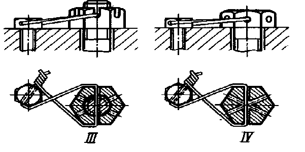 О На рис. (9, III) показан способ вязки через пазы корончатой гайки и отверстие в болте. Этот способ обеспечивает, с одной стороны, фиксацию гайки на болту, с другой - фиксацию болта относительно корпуса.
