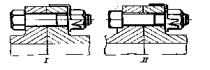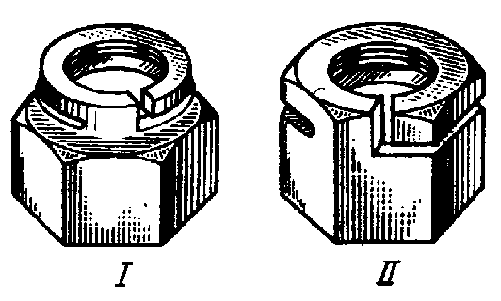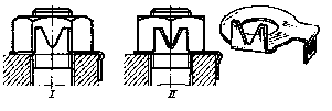 рис. 10 рис. 11 На рис.10 показан простейший способ увеличения трения в резьбе к концу затяжки путем деформации последних (по ходу завертывания гайки) витков резьбы (например, кернов-кой). Недостаток этого способа — отсутствие упругости, необходимой для поддержания натяга в резьбе при всех условиях работы. На рис.11 изображены самоконтрящиеся гайки с удлиненной коронкой, целой или разрезной, которая при изготовлении обжимается. При завертывании гайки в момент, когда нарезная часть болта входит в обжатый участок, в резьбе возникает повышенное трение. Гайки с разрезными коронками (рис. 11,II) обеспечивают более надежное стопорение благодаря упругости лепестков коронки.
