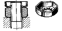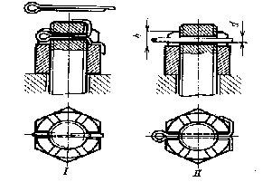 Стопорение шплинтами (шплинтовка) гаек — надежный и очень распространенный способ стопорения, применяемый в наиболее ответственных узлах. На рис. 3 для сравнения с более современными способами шплинтовки гаек приведен устаревший способ шплинтовки. Недостатки этого способа - ослабление болта на рабочем, напряженном участке, ограниченность хода гайки в пределах шплинтуемое™. В современных конструкциях (рис. 4) для увеличения хода затяжки (пределов шплинтуемости) в верхней части гайки делают пазы (обычно шесть — по числу граней гайки) глубиной и, существенно большей диаметра d шплинта. Шплинт, выполненный из проволоки полукруглого сечения, вводят в один из пазов гайки и в поперечное отверстие в верхней, ненагруженной, части болта; концы шплинта отгибают.