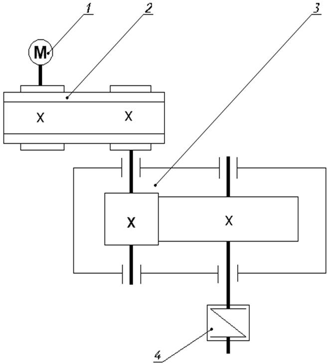 1 – електродвигун; 2 – ремінна передача; 3 – редуктор; 4 – муфта. Рисунок 1 – Кінематична схема привода 2 Розрахункова частина 2.1 Вибір електродвигуна, кінематичний і силовий розрахунок привода Визначаємо загальний коефіцієнт корисної дії привода за формулою: