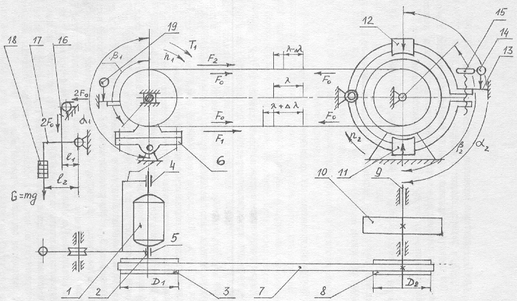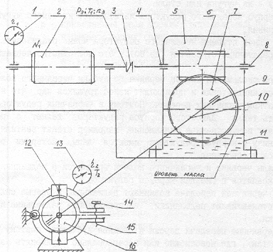 Устанавливают стрелки индикаторов пружин электродвигателя и тормоза 14 и 19 на ноль поворотом внешнего кольца индикаторов. Включают электродвигатель, проверяют работу тахометров. Закручивая рукоятку винтового механизма тормоза проводя ступенчатое нагружение передачи. Передачу нагружают до буксования ремня, что соответствует примерно 170 делениям второго индикатора.