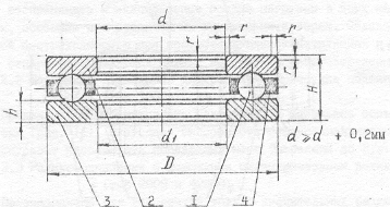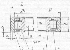 Могут воспринимать лишь осевые нагрузки: одинарные – только в одном направлении (рис. г), сдвоенные – в двух направлениях. Чувствительны к перекосам. Предельные частоты вращения ограничены, поэтому при повышенных скоростях и особенно на горизонтальных валах их применять не следует.