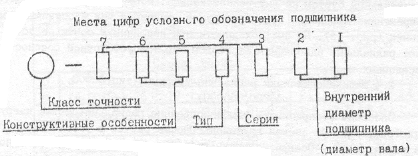Для определения характеристик стандартного подшипника качений его подвергают маркировке, нанося на торец (обычно внешнего кольца) основное условное обозначение, структура которого представлена на рис.