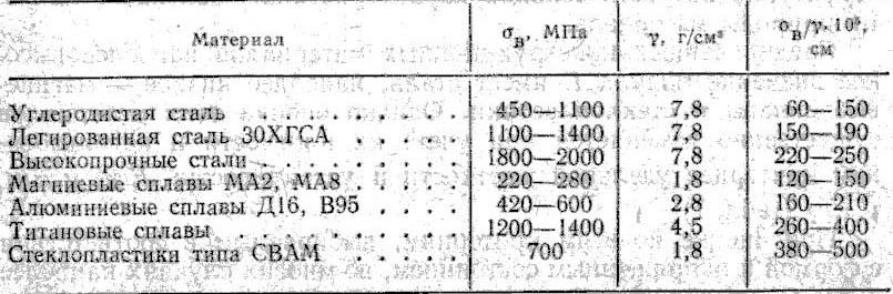 Т При оценке по этим критериям, выбираемыми в соответствии с формой и напряженным состоянием, во многих случаях наиболее выгодным материалом являются магниевые сплавы и стеклопластики, наименее выгодным - углеродистые и легированные стали. Прочность - способность тела сопротивляться деформациям и разрушению. Большинство технических характеристик прочности (в, 0,2) определяют в результате статического испытания на растяжение. Эти характеристики зависят от структуры и термической обработки. Прочность конструкционных материалов, используемых в технике, изменяется в очень широком диапазоне - от 100150 до 2500350О МПа. Однако выбор материала только по абсолютному значению показателей прочности т (0,2), в и др. не дает правильной оценки возможностей материала. Для создания конструкции (машины) с минимальной массой большое значение имеет плотность материалов . С учетом этого более правильно оценивать значение его удельной прочности отношением характеристик прочности т, в и др. к плотности материала (например, в/, т/, где - плотность материала, г/см3). Из данных, приведенных в табл.2, видно, что, например, алюминиевые сплавы, имея значительно меньшую абсолютную прочность, чем углеродистые и многие легированные стали, превосходят их по удельной прочности. Это означает, что при равной прочности масса изделия из алюминиевых сплавов меньше, чем Таблица 2. Удельная прочность некоторых конструкционных материалов