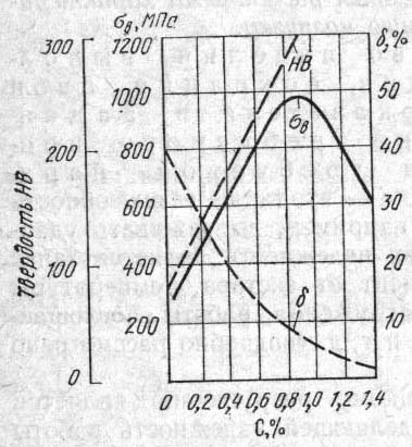 Сплавы железа - сталь и чугун - основные металлические материалы, используемые в различных отраслях народного хозяйства. Наиболее широко применяют стали. Они должны иметь хорошие технологические свойства: легко обрабатываться давлением (многие изделия получают прокаткой, ковкой или штамповкой), а также хорошо обрабатываются на металлорежущих станках, свариваться. В ряде случаев от них требуется высокая коррозионная стойкость или жаропрочность и т. д. Достоинством сталей является возможность получать нужный комплекс свойств, изменяя их состав и вид обработки. Стали подразделяют на углеродистые и легированные. Углеродистые стали - это основной конструкционный материал, который используют в различных областях промышленности. Они проще в производстве и значительно дешевле легированных. Свойства их определяются количеством углерода и содержанием присутствующих в них примесей, которые взаимодействуют и с железом, и с углеродом. 1.1 Влияние углерода Механические свойства углеродистой стали зависят главным образом от содержания углерода. С ростом содержания углерода в стали увеличивается количество цементита и соответственно уменьшается количество феррита, т. е. повышаются прочность и твердость и уменьшается пластичность. Как видно из графика, приведенного на рис.1, прочность повышается только до 1 % С, а при более высоком содержании углерода она начинает уменьшаться. Происходит это потому, что образующаяся по границам зерен в заэвтектоидных сталях сетка вторичного цементита снижает прочность