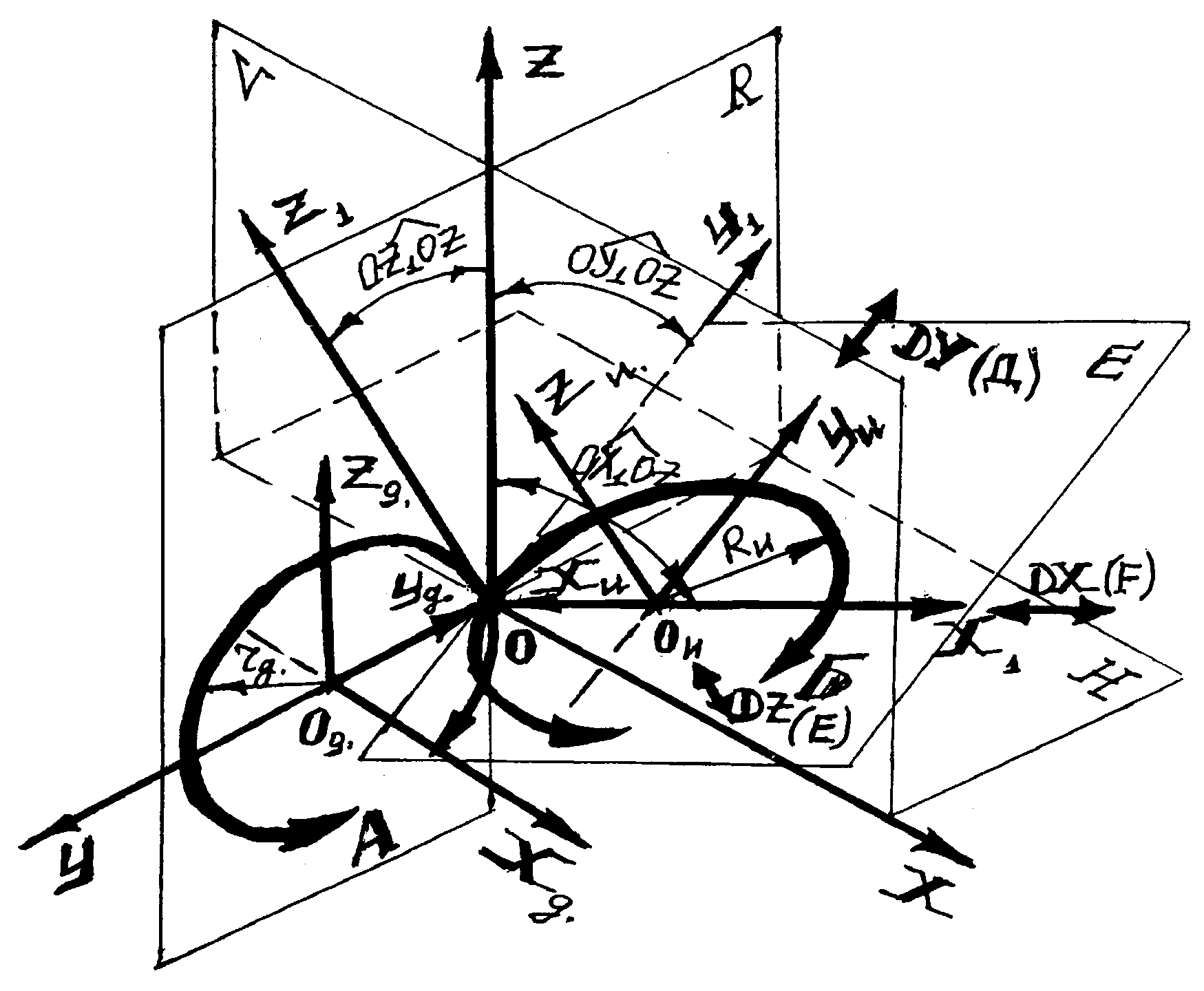 Определение новых способов механической обработки из принципиально – возможных и выбор наиболее эффективных с помощью ЭВМ. Используя основные положения теории формообразования поверхностей инструментами, изложенные в работе [1] покажем, что все процессы формообразования различных поверхностей деталей машин имеют кинематическое единство. Поэтому каждый конкретный способ формообразования той или иной поверхности является лишь частным случаем формообразования какой-то произвольной поверхности и может быть рассмотрен в общем виде при использовании наиболее сложных кинематических схем резания или схем формообразования. Согласно указанной теории режущий инструмент обрабатывает поверхность контактным способом и в процессе обработки выполняет две функции, резание и формообразование. Поэтому перемещение режущей кромки в процессе формообразования должно быть связано с таким рабочим движением, при котором обеспечивается хотя бы ее периодическое касание с номинальной (теоретически заданной) поверхностью. С другой стороны, для выполнения функции резания движение кромки должно таким, чтобы припуск на номинальной поверхности детали срезался слоями, по заданному закону. В связи с этим, для удаления всего припуска инструмент должен сделать серию движений резания, благодаря которым его режущая кромка (или кромки, производящей поверхности инструмента, расположенные по линии криволинейной координаты f) создает семейство поверхностей резания, где каждая последующая поверхность резания смещена относительно предыдущей. Движение инструмента, вызывающее такое смещение поверхностей резания, называется подачей, поэтому: параметр подачи является параметром семейства поверхностей резания. Инструмент может иметь несколько подач. Каждая подача вызывает образование семейства поверхностей резания. При большом числе подач режущая кромка инструмента может создать очень сложную систему семейств поверхностей резания. При любой такой системе для процесса формообразования поверхности имеют значения только те подачи, которые определяют перемещение по номинальной поверхности детали точки касания режущей кромки при образовании семейств поверхностей резания. Закон, по которому создана система одного или нескольких семейств поверхностей резания, определяет схема резания или схема формообразования, так как она задает уравнение движения режущей кромки как линии или твердого тела в пространстве. Сложность кинематической схемы формообразования определяется количеством подач инструмента, которое зависит от наличия составляющих движений, указанных на схеме. Таким образом, наличие всех движений на универсальной кинематической схеме будет определять закон расположения поверхностей резания в пространстве, который в свою очередь будет задавать траекторию движения формообразования. Так как характер траектории связан с соотношением движений, выполняемых режущей кромки, то ее вид остается произвольным в системе координат XoYoZo. Любая номинальная поверхность детали в той же системе может быть задана также произвольно. Двумя линиями криволинейных координат g и п, которые для одной и той же поверхности могут быть выбраны в весьма широких пределах. Будем рассматривать процесс формообразования поверхности множеством Zu и кромок. 
