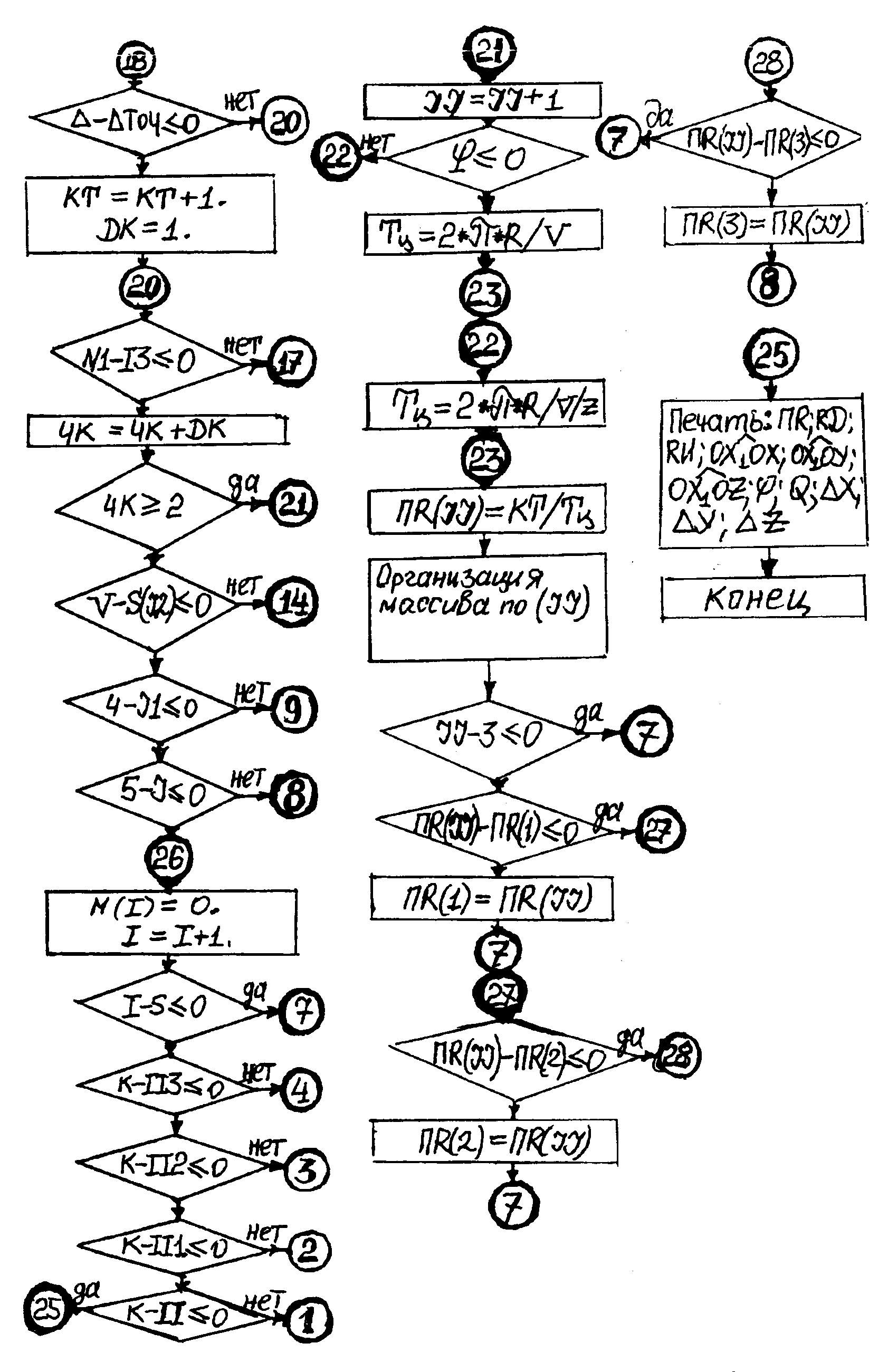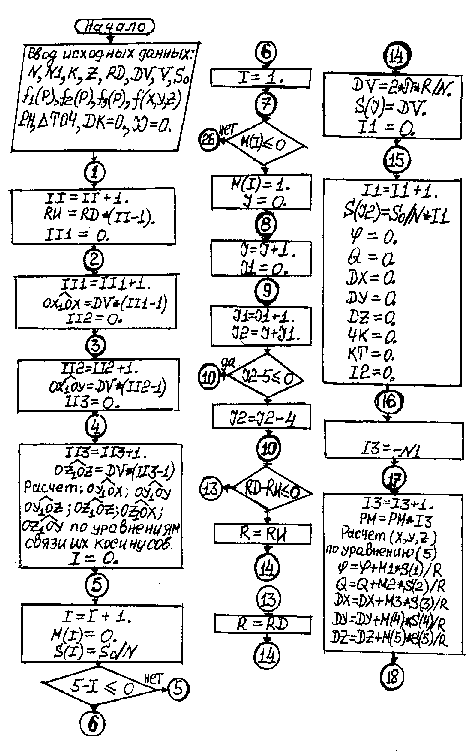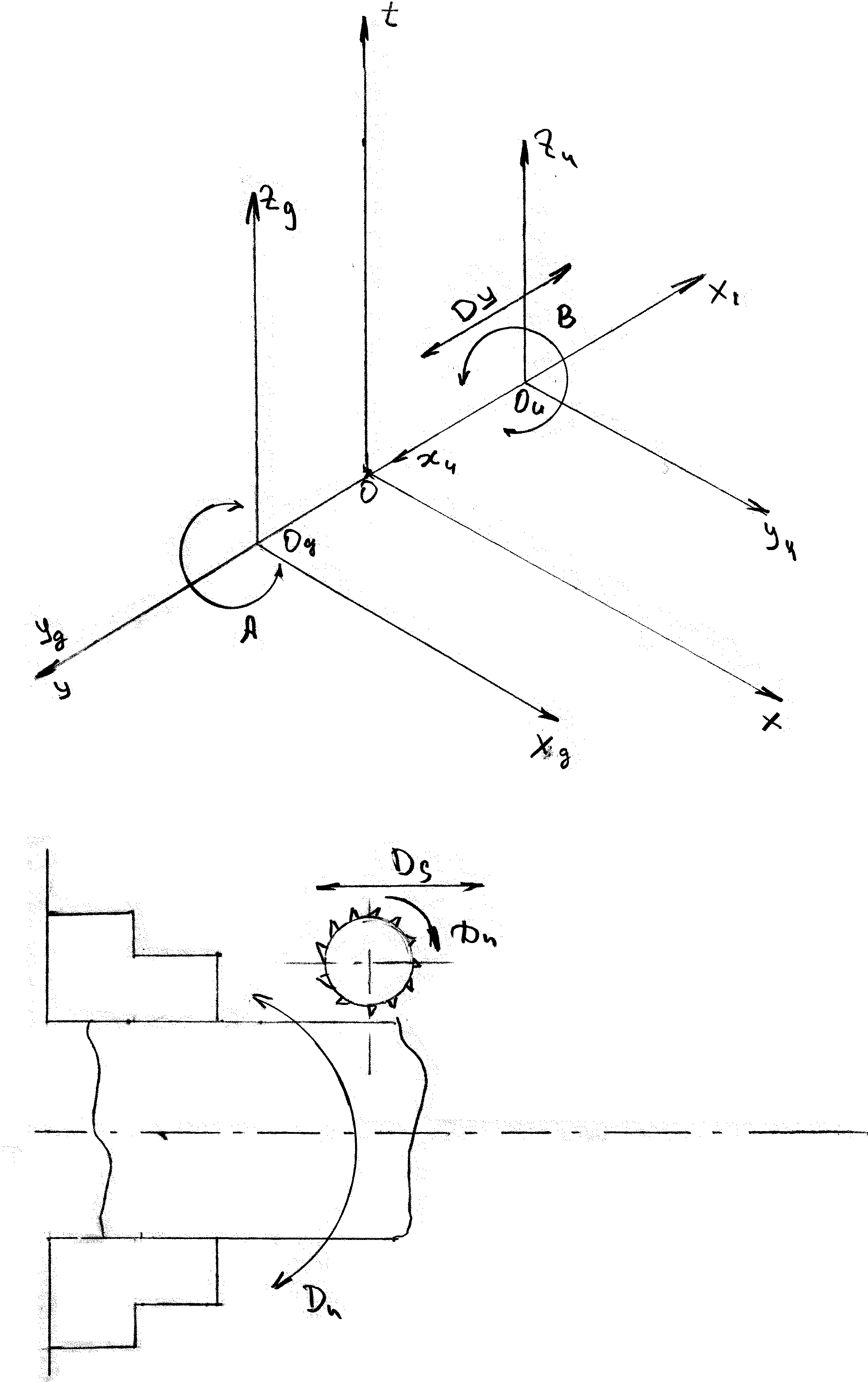 После получения данной информации на печать ЭВМ можно изображать полученную схему формообразования по примеру графического исполнения кинематических схем резания, приведенного в работе Грановского Г.И.. Только с уточнением стрелки одного из показанных на схеме движений как главного рабочего или движения определяющего скорость резания. Анализ найденных на ЭВМ кинематических схем резания. Если для поиска возможных схем формообразования, номинальная поверхность детали задана алгебраическим уравнением: Y2g + Z2g = r2g Y2g + Z2g – r2g то это есть поверхность вращения сориентированная в системы координат детали так, что её направляющая линия - окружность соответствует плоскости YOZ основной системы координат с радиусом rg, заданным конкретным цифровым значением rg = 10. Инструмент также предварительно задаётся как линия или точка в системе координат инструмент, Xu = fi(P) = Ru Yu= f2(P) = 0 Т.е. точка на радиусе Ru = 10 Zu = f3(P) = 0 После поиска ЭВМ (как один из найденных вариантов) печатает следующие параметры схемы формообразования, включая ранее заданные: cos(OX1OX) = l; cos(OY1OX) = 0; cos(OZ,OY) = -1 = 1; Q = 1; Dx = l; Dy = 0; Dz = 0; Пр = 20 КТ/сек OX1OX = 0°; OY1OX = 90°; OZ1OY = 180°