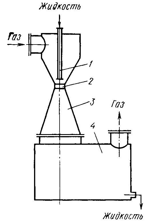 Рис 1. Реактор полного смешения – скруббер Вентури: 1 – сопло; 2 – горловина; 3 – камера смешения; 4 – разделительная камера – инерционный параметр, отнесенный к скорости газа в горловине; при 90% является однозначной функцией перепада давления в скруббере.Главный дефект скруббера Вентури — большой расход энергии по преодолению высокого гидравлического сопротивления, которое в зависимости от скорости газа в горловине может составлять 0,002-0,013 МПа. Помимо того, аппарат не отличается надежностью в эксплуатации, управление им сложное. Основной недостаток всех методов мокрой очистки газов от аэрозолей — это образование больших объемов жидких отходов (шлама). Таким образом, если не предусмотрены замкнутая система водооборота и утилизация всех компонентов шлама, то мокрые способы газоочистки по существу только переносят загрязнители из газовых выбросов в сточные воды, т. е. из атмосферы в водоемы. Электростатическая очистка газов служит универсальным средством, пригодным для любых аэрозолей, включая туманы кислот, и при любых размерах частиц. Метод основан на ионизации и зарядке частиц аэрозоля при прохождении газа через электрическое поле высокого напряжения, создаваемое коронирующими электродами. Осаждение частиц происходит на заземленных осадительных электродах. Промышленные электрофильтры состоят из ряда заземленных пластин или труб, через которые пропускается очищаемый газ. Между осадительными электродами подвешены проволочные коронирующие электроды, к которым подводится напряжение 25–100 кВ. Теоретическое выражение для степени улавливания аэрозолей в трубчатых электрофильтрах имеет вид