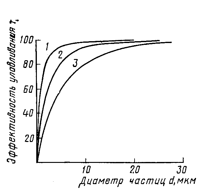 Рис 2. Кривые зависимости степени улавливания пыли в электрофильтре от размеров частиц: 1 – pEEo = 160; 2 – pEEo = 80; 3 – pEEo = 40; При очистке от пыли сухих газов электрофильтры могут работать в широком диапазоне температур (от 20 до 500 °С) и давлений. Их гидравлическое сопротивление невелико – 100-150 Па. Степень очистки от аэрозолей – выше 90, достигая 99,9% на многопольных электрофильтрах при d > 1 мкм. Недостаток этого метода – большие затраты средств на сооружение и содержание очистных установок и значительный расход энергии на создание электрического поля. Расход электроэнергии на электростатическую очистку – 0,1-0,5 кВт на 1000 м3 очищаемого газа. Звуковая и ультразвуковая коагуляция, а также предварительная электризация пока мало применяются в промышленности и находятся в основном в стадии разработки. Они основаны на укрупнении аэрозольных частиц, облегчающем их улавливание традиционными методами. Аппаратура звуковой коагуляции состоит из генератора звука, коагуляционной камеры и осадителя. Звуковые и ультразвуковые методы применимы для агрегирования мелкодисперсных аэрозольных частиц (тумана серной кислоты, сажи) перед их улавливанием другими методами. Начальная концентрация частиц аэрозоля для звуковой коагуляции должна быть не менее 2 г/м3 (для частиц d = l10 мкм).