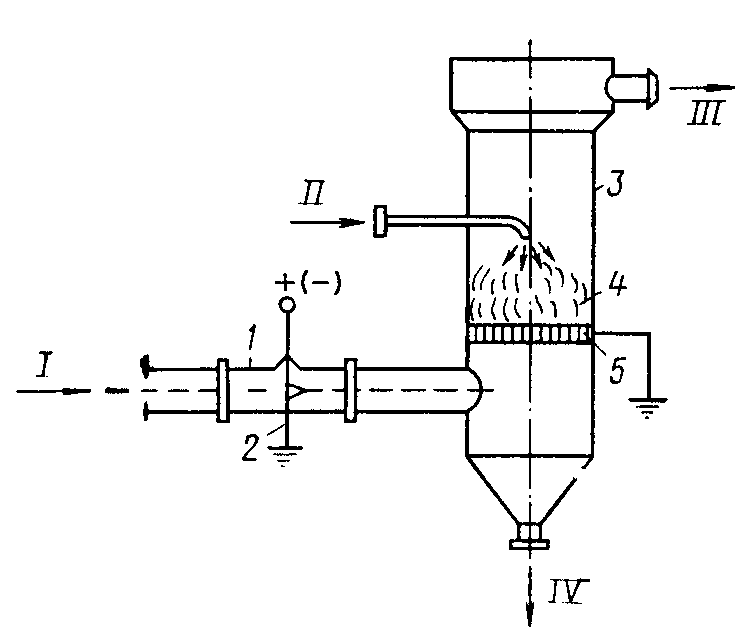 1 – камера электризации; 2 – коронирующий электрод; 3 – пенный аппарат; 4 – газожидкостный (пенный) слой; 5 – заземленная решетка; I – очищаемый газ; II – вода; III – очищенный газ; IV – слив шлама оагуляцию аэрозолей методом предварительной электризации производят, например, пропусканием газа через электризационную камеру с коронирующими электродами, где происходит зарядка и коагуляция частиц, а затем через мокрый газоочиститель, в котором газожидкостный слой служит осадительным электродом (рис. 3). Осадительным электродом может служить пенный слой в пенных аппаратах, слой газожидкостной эмульсии в насадочных скрубберах и других мокрых газопромывателях, в которых решетки или другие соответствующие детали должны быть заземлены.Очистка газов от парообразных и газообразных примесей. Газы в промышленности обычно загрязнены вредными примесями, поэтому очистка широко применяется на заводах и предприятиях для технологических и санитарных (экологических) целей. Промышленные способы очистки газовых выбросов от газо- и парообразных токсичных примесей можно разделить на три основные группы:
