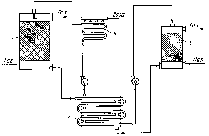 Рис. 4. Схема установки для абсорбционно-десорбционного метода разделения газов: 1 — абсорбер; 2 — десорбер; 3 — теплообменник; 4 — холодильник Абсорбенты, применяемые в промышленности, оцениваются по следующим показателям: 1) абсорбционная емкость, т. е. растворимость извлекаемого компонента в поглотителе в зависимости от температуры и давления; 2) селективность, характеризуемая соотношением растворимостей разделяемых газов и скоростей их абсорбции; 3) минимальное давление паров во избежание загрязнения очищаемого газа парами абсорбента; 4) дешевизна; 5) отсутствие коррозирующего действия на аппаратуру. В качестве абсорбентов применяют воду, растворы аммиака, едких и карбонатных щелочей, солей марганца, этаноламины, масла, суспензии гидроксида кальция, оксидов марганца и магния, сульфат магния и др. Очистная аппаратура аналогична уже рассмотренной аппаратуре мокрого улавливания аэрозолей. Наиболее распространен насадочный скруббер, применяемый для очистки газов от диоксида серы, сероводорода, хлороводорода, хлора, оксида и диоксида углерода, фенолов и т. д. В насадочных скрубберах скорость массообменных процессов мала из-за малоинтенсивного гидродинамического режима этих реакторов, работающих при скорости газа г = 0,020,7 м/с. Объемы аппаратов поэтому велики и установки громоздки. Для очистки выбросов от газообразных и парообразных примесей применяют и интенсивную массообменную аппаратуру — пенные аппараты, безнасадочный форсуночный абсорбер, скруббер Вентури, работающие при более высоких скоростях газа. Пенные абсорберы работают при г = 14 м/с и обеспечивают сравнительно высокую скорость абсорбционно-десорбционных процессов; их габариты в несколько раз меньше, чем насадочных скрубберов. При достаточном числе ступеней очистки (многополочный пенный аппарат) достигаются высокие показатели глубины очистки: для некоторых процессов до 99,9%. Особенно перспективны для очистки газов от аэрозолей и вредных газообразных примесей пенные аппараты со стабилизатором пенного слоя. Они сравнительно просты по конструкции и работают в режиме высокой турбулентности при линейной скорости газа до 4-5 м/с.