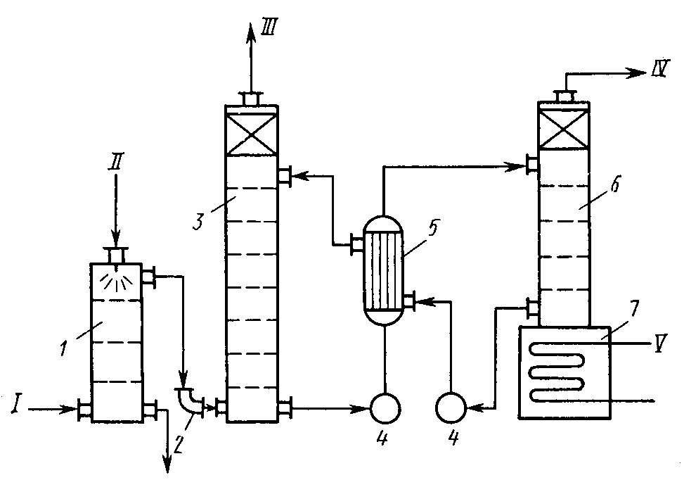 П Рис. 5. Схема абсорбционной очистки газов от СО2 с получением товарного диоксида углерода: 1 — холодильник; 2 — воздуходувка; 3 — пенный абсорбер; 4 — насос; 5 — теплообменник; 6 — пенный десорбер; 7 — кипятильник десорбера; I — газ на очистку; II — вода; III — очищенный газ; IV — диоксид углерода потребителю; V — пар римером безотходной абсорбционно-десорбционной циклической схемы может служить поглощение диоксида углерода из отходящих газов растворами моноэтаноламина с последующей регенерацией поглотителя при десорбции СОа. На рис. 5 приведена схема абсорции СО2 в пенных абсорберах; десорбция СО2 проводится также при пенном режиме. Установка безотходна, так как чистый диоксид углерода после сжижения передается потребителю в виде товарного продукта. Абсорбционные методы характеризуются непрерывностью и универсальностью процесса, экономичностью и возможностью извлечения больших количеств примесей из газов. Недостаток этого метода в том, что насадочные скрубберы, барботажные и даже пенные аппараты обеспечивают достаточно высокую степень извлечения вредных примесей (до ПДК) и полную регенерацию поглотителей только при большом числе ступеней очистки. Поэтому технологические схемы мокрой очистки, как правило, сложны, многоступенчаты и очистные реакторы (особенно скрубберы) имеют большие объемы. Любой процесс мокрой абсорбционной очистки выхлопных газов от газо- и парообразных примесей целесообразен только в случае его цикличности и безотходности. Но и циклические системы мокрой очистки конкурентоспособны только тогда, когда они совмещены с пылеочисткой и охлаждением газа. Адсорбционные методы применяют для различных технологических целей — разделение парогазовых смесей на компоненты с выделением фракций, осушка газов и для санитарной очистки газовых выхлопов. В последнее время адсорбционные методы выходят на первый план как надежное средство защиты атмосферы от токсичных газообразных веществ, обеспечивающее возможность концентрирования и утилизации этих веществ. Адсорбционные методы основаны на избирательном извлечении из парогазовой смеси определенных компонентов при помощи адсорбентов — твердых высокопористых материалов, обладающих развитой удельной поверхностью Sуд (Sуд — отношение поверхности к массе, м2/г). Промышленные адсорбенты, чаще всего применяемые в газоочистке, — это активированный уголь, силикагель, алюмогель, природные и синтетические цеолиты (молекулярные сита). Основные требования к промышленным сорбентам — высокая поглотительная способность, избирательность действия (селективность), термическая устойчивость, длительная служба без изменения структуры и свойств поверхности, возможность легкой регенерации. Чаще всего для санитарной очистки газов применяют активный уголь благодаря его высокой поглотительной способности и легкости регенерации. Адсорбцию газовых примесей обычно ведут в полочных реакторах периодического действия без теплообменных устройств; адсорбент расположен на полках реактора. Когда необходим теплообмен (например, требуется получить при регенерации десорбат в концентрированном виде), используют адсорберы с встроенными теплообменными элементами или выполняют реактор в виде трубчатых теплообменников; адсорбент засыпан в трубки, а в межтрубном пространстве 