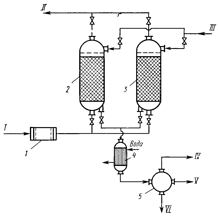 Адсорбционный метод особенно рационален для удаления токсических примесей (органических соединений, паров ртути и др.), содержащихся в малых концентрациях, т. е. как завершающий этап санитарной очистки отходящих газов. Недостатки большинства адсорбционных установок — периодичность процесса и связанная с этим малая интенсивность реакторов, высокая стоимость периодической регенерации адсорбентов. Применение непрерывных способов очистки в движущемся и кипящем слое адсорбента частично устраняет эти недостатки, но требует высокопрочных промышленных сорбентов, разработка которых для большинства процессов еще не завершена. К Рис. 6. Схема адсорбционной газоочистной установки: / — фильтр; 2, 3 — адсорберы; 4 — конденсатор; 5 — сепаратор; / — очищаемый газ; // — очищенный газ; ///—водяной пар; IV — неконденсируе.уые пары; V—сконденсированный адсорбтив в хранилище; VI — водный конденсат аталитические методы очистки газов основаны на реакциях в присутствии твердых катализаторов, т. е. на закономерностях гетерогенного катализа (см. гл. 5). В результате каталитических реакций примеси, находящиеся в газе, превращаются в другие соединения, т. е. в отличие от рассмотренных методов примеси не извлекаются из газа, а трансформируются в безвредные соединения, присутствий: которых допустимо в выхлопном газе, либо в соединения, легко удаляемые из газового потока. Если образовавшиеся вещества подлежат удалению, то требуются дополнительные операции (например, извлечение жидкими или твердыми сорбентами).