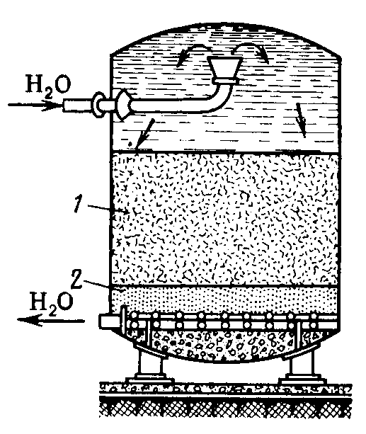Рис. 7. Катионитовый фильтр: 1 – катионит; 2 – песок Адсорбционно-каталитические методы применяют для очистки промышленных выбросов от диоксида серы, сероводорода и серо-органических соединений. Катализатором окисления диоксида серы в триоксид и сероводорода в серу служат модифицированный добавками активированный уголь и другие углеродные сорбенты. В присутствии паров воды на поверхности угля в результате окисления SO2 образуется серная кислота, концентрация которой в адсорбенте составляет в зависимости от количества водяного пара при регенерации угля от 15 до 70%. Схема каталитического окисления H2S во взвешенном слое высокопрочного активного угля приведена на рис. 8. Окисление H2S происходит по реакции H2S + 1/2 О2 = Н2О + S