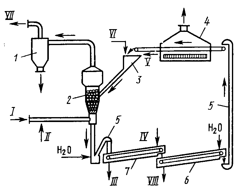 А Рис. 8. Схема каталитической очистки газа от сероводорода во взвешенном слое активного угля: 1 – циклон-пылеуловитель; 2 – реактор со взвешенным слоем; 3 – бункер с питателем; 4 – сушильная камера; 5 – элеватор; 6 – реактор промывки катализатора (шнек); 7 – реактор экстракции серы (шнек-растворитель); I – газ на очистку; II – воздух с добавкой NH3; III – раствор (NH4)2Sn на регенерацию; IV – раствор (NH4)2S; V – регенерированный уголь;VI – свежий активный уголь; VII – очищенный газ; VIII – промывные воды ктиваторами этой каталитической реакции служат водяной пар и аммиак, добавляемый к очищаемому газу в количестве ~0,2г/м3. Активность катализатора снижается по мере заполнения его пор серой и когда масса S достигает 70—80% от массы угля, катализатор регенерируют промывкой раствором (NH4)2S. Промывной раствор полисульфида аммония разлагают острым паром с получением жидкой серы. Представляет большой интерес очистка дымовых газов ТЭЦ или других отходящих газов, содержащих SO2 (концентрацией 1-2% SO2), во взвешенном слое высокопрочного активного угля с получением в качестве товарного продукта серной кислоты и серы. Другим примером адсорбционно-каталитического метода может служить очистка газов от сероводорода окислением на активном угле или на цеолитах во взвешенном слое адсорбента-катализатора. Широко распространен способ каталитического окисления токсичных органических соединений и оксида углерода в составе отходящих газов с применением активных катализаторов, не требующих высокой температуры зажигания, например металлов группы платины, нанесенных на носители. В промышленности применяют также каталитическое восстановление и гидрирование токсичных примесей в выхлопных газах. На селективных катализаторах гидрируют СО до CH4 и Н2О, оксиды азота — до N2 и Н2О etc. Применяют восстановление оксидов азота в элементарный азот на палладиевом или платиновом катализаторах. Каталитические методы получают все большее распространение благодаря глубокой очистке газов от токсичных примесей (до 99,9%) при сравнительно невысоких температурах и обычном давлении, а также при весьма малых начальных концентрациях примесей. Каталитические методы позволяют утилизировать реакционную теплоту, т.е. создавать энерготехнологические системы. Установки каталитической очистки просты в эксплуатации и малогабаритны. Недостаток многих процессов каталитической очистки — образование новых веществ, которые подлежат удалению из газа другими методами (абсорбция, адсорбция), что усложняет установку и снижает общий экономический эффект. Термические методы обезвреживания газовых выбросов применимы при высокой концентрации горючих органических загрязнителей или оксида углерода. Простейший метод — факельное сжигание — возможен, когда концентрация горючих загрязнителей близка к нижнему пределу воспламенения. В этом случае примеси служат топливом, температура процесса 750—900 °С и теплоту горения примесей можно утилизировать. Когда концентрация горючих примесей меньше нижнего предела воспламенения, то необходимо подводить некоторое количество теплоты извне. Чаще всего теплоту подводят добавкой горючего газа и его сжиганием в очищаемом газе. Горючие газы проходят систему утилизации теплоты и выбрасываются в атмосферу. Такие энерготехнологические схемы применяют при доста