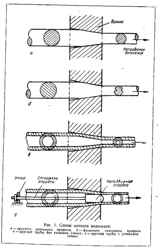 Реферат: Методы волочения металловРеферат: Методы волочения металловМЕТОДЫ ВОЛОЧЕНИЯВолочением называется способ обработки металла давлением, при котором обрабатываемый металл в виде полосы с одинаковым поперечным сечением вводится в канал волочильного инструмента и протягивается (проволакивается) через него. Этот канал имеет поперечные сечения, одинаковые по своей форме или близкие к форме поперечного сечения протягиваемого металла, но плавно уменьшающиеся от места входа металла в инструмент к месту его выхода. Выходное сечение канала всегда меньше поперечного сечения протягиваемой полосы. Поэтому последняя, проходя через волоку, деформируется и изменяет свое поперечное сечение, принимая после выхода из волоки форму и размеры наименьшего сечения канала. Длина полосы при этом увеличивается прямо пропорционально уменьшению поперечного сечения. Перед волочением на специальном станке заостряют передний конец полосы, предназначенной для обработки, с таким расчетом, чтобы конец легко входил в волоку и частично выходил с ее противоположной стороны. Этот конец захватывают специальным механизмом и протягивают. Схемы основных методов волочения показаны на рисунке. Чтобы уменьшить внешнее трение, между поверхностями протягиваемого металла и волочильного канала вводят смазку. Это уменьшает расход энергии на волочение, способствует получению гладкой поверхности у протягиваемого металла, сильно уменьшает износ самого канала и позволяет осуществлять процесс с повышенными степенями деформации. Для уменьшения внешнего трения и повышения стойкости канала часто применяют метод волочения с противонатяжением. Сущность его заключается в следующем. К протягиваемому металлу со стороны входа его в волоку прикладывают силу, направленную в сторону, противоположную движению металла, и потому называемую противонатяжением. От этого в полосе еще до ее входа в волочильный канал в осевом направлении создаются растягивающие напряжения. Они вызывают, как это будет доказано далее, уменьшение давления металла на стенки канала, что, естественно, увеличивает стойкость последнего. Этот