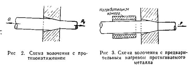 метод имеет и некоторые недостатки, отмеченные далее, и потому не всегда применятся. В большинстве случаев металл, обрабатываемый волочением, предварительно не нагревают: он входит в волочильный канал при комнатной температуре, а образующееся в канале тепло деформации и внешнего трения отводят, непрерывно омывая волоки охлаждающей эмульсией, водой, или окружающим воздухом. При таком холодном волочении с надлежащей смазкой и инструментом протянутый металл имеет гладкую блестящую поверхность и достаточно точные размеры поперечного сечения. В некоторых специальных случаях, когда деформируемый металл обладает недостаточной пластичностью, при комнатной температуре или высоким сопротивлением деформированию, волочение ведут в предварительно нагретом состоянии. Например, при волочении цинковой проволоки для увеличения пластичности заготовки ее предварительно подогревают до 80—90°, погружая моток в нагретую воду. В очаге деформации температура проволоки доходит до 120—150°, т. е. до температуры, при которой образуется максимальное количество систем скольжения. При волочении вольфрама и молибдена, имеющих при комнатной температуре особо высокую сопротивляемость пластическому деформированию, их предварительно нагревают до 700—800°, пропуская протягиваемый металл через нагревательную камеру, установленную перед волокой. В настоящее время намечается применение процесса горячего волочения при протяжке профилей сложных форм и для уменьшения сопротивления деформированию в тех случаях, когда это допускается требованиями к поверхности, механическим свойствам и точности размеров поперечного сечения. Из приведенных схем волочения следует, что все они обладают тремя следующими, отличающими их от прочих видов обработки металлов давлением признаками: а) линейные размеры поперечных сечений протягиваемого металла могут уменьшаться до заданных величин во всех направлениях одновременно; б) возможность получить не изменяющийся по длине полосы как сплошной, так и полый профили почти любой формы и таких чиненных размеров его поперечного сечения, какие позволяет техника изготовления волочильных каналов, в) величина деформации за один пропуск ограничивается максимально допустимым напряжением растяжения, возникающим в поперечном сечении протягиваемого металла у выхода из очага деформации. Естественно, что это не ограничивает величины суммарной деформации между отжигами, которой может быть подвергнут металл, обрабатываемый волочением Путем ряда последовательных протяжек можно получить суммарную деформацию любой величины, в зависимости от пластических свойств протягиваемого металла Волочение применяется1. Для производства профилей большой длины, но сравнительно малых и очень малых сечений различных форм с отношением ширины к толщине поперечного сечения, не превышающим примерно 12. Такое изделие называется проволокой. Вследствие большой длины проволоку либо свертывают в мотки, либо наматывают на катушки Волочением можно получить проволоку диаметром до 6—8 мм. Для дальнейшего уточнения приходится применять процессы, не требующие волок, например процесс равномерного растяжения, рассмотренный в конце настоящей главы, процесс электролитического растворения периферийных слоев. 2 Для производства профилей средних и бол