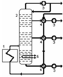 Принципиальная схема для промышленной перегонки нефти приведена на рисунке. Исходная нефть прокачивается насосом через теплообменники 4, где нагревается под действием тепла отходящих нефтяных фракций и поступает в огневой подогреватель (трубчатую печь) 1. В трубчатой печи нефть нагревается до заданной температуры и входит в испарительную часть (питательную секцию) ректификационной колонны 2. В процессе нагрева часть нефти переходит в паровую фазу, которая при прохождении трубчатой печи все время находится в состоянии равновесия с жидкостью. Как только нефть в виде парожидкостной смеси выходит из печи и входит в колонну (где в результате снижения давления дополнительно испаряется часть сырья), паровая фаза отделяется от жидкой и поднимается вверх по колонне, а жидкая перетекает вниз. Паровая фаза подвергается ректификации в верхней части колонны. В ректификационной колонне размещены ректификационные тарелки, на которых осуществляется контакт поднимающихся по колонне паров со стекающей жидкостью (флегмой). Флегма создается в результате того, что часть верхнего продукта, пройдя конденсатор-холодильник 3, возвращается на верхнюю тарелку и стекает на нижележащие, обогащая поднимающиеся пары низкокипящими компонентами. Для ректификации жидкой части сырья в нижней части ректификационной части колонны под нижнюю тарелку необходимо вводить тепло или какой-либо испаряющий агент 5. В результате легкая часть нижнего продукта переходит в паровую фазу и тем самым создается паровое орошение. Это орошение, поднимаясь с самой нижней тарелки и вступая в контакт со стекающей жидкой фазой, обогащает последнюю высококипящими компонентами. В итоге сверху колонны непрерывно отбирается низкокипящая фракция, снизу – высококипящий остаток. Испаряющий агент вводится в ректификационную колону с целью повышения концентрации высококипящих компонентов в остатке от перегонки нефти. В качестве испаряющего агента используются пары бензина, лигроина, керосина, инертный газ, чаще всего – водяной пар. В присутствии водяного пара в ректификационной колонне снижается парциальное давление углеводородов, а следовательно их температура кипения. В результате наиболее низкокипящие углеводороды, находящиеся в жидкой фазе после однократного испарения, переходят в парообразное состояние и вместе с водяным паром поднимаются вверх по колонне. Водяной пар проходит всю ректификационную колонну и уходит с верхним продуктом, понижая температуру в ней на 10-20°С. На практике применяют перегретый водяной пар и вводят его в колонну с температурой, равной температуре подаваемого сырья или несколько выше (обычно не насыщенный пар при температуре 350-450°С под давлением 2-3 атмосферы). Влияние водяного пара заключается в следующем: · интенсивно перемешивается кипящая жидкость, что способствует испарению низкокипящих углеводородов; · создается большая поверхность испарения тем, что испарение углеводородов происходит внутрь множества пузырьков водяного пара. Расход водяного пара зависит от количества отпариваемых компонентов, их природы и условий внизу колонны. Для хорошей ректификации жидкой фазы внизу колонны необходимо, чтобы примерно 25% ее переходило в парообразное состояние. В случае применения в качестве испаряющего агента инертного газа происхо