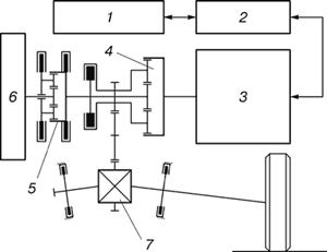 Рис. 1. Схема гибридного силового агрегата с маховичным накопителем и электромеханическим приводом фирмы "BMW" (Германия): 1 – источник тока; 2 – система управления; 3 – обратимая электромашина; 4 – дифференциальный механизм; 5 – мультипликатор; 6 – маховичный накопитель; 7 – главная передача Источник тока 1 через преобразователи и систему управления 2 связан с обратимой электромашиной 3, рассчитанной на максимальную мощность электромобиля. Электромашина 3 через сложный дифференциальный механизм 4 с мультипликатором 5 связана с маховиком 6 накопителя и главной передачей 7. В результате масса источника тока 1, например, топливного элемента, может быть выбрана исходя из удельной энергии, а не удельной мощности, что снижает ее для электромобиля и электробуса с пробегом, соответственно, 400 и 600км до 100...150 и 700...1000кг. Это вполне приемлемо для данных транспортных средств. Однако непременным недостатком всех схем с электроприводом остается наличие тяжелого и сложного обратимого электродвигателя. Это отражается на экономичности привода и его массе, включая систему преобразователей тока. Мощная электромашина неэкономична при работе на малых мощностях, характерных для разгона (зарядки) маховичного накопителя. Кроме того, в схеме, помимо главной передачи, присутствует сложный по конструкции и управлению дифференциальный механизм с мультипликатором и тремя системами фрикционного управления (муфтами или тормозами), что усложняет и удорожает привод. Концепция электромобиля Новая концепция электромобиля, предложенная проф. Н.В.Гулиа, состоит в максимальном приближении и унификации устройств электро- и автомобиля. Это позволяет предельно упростить и уменьшить массу силового агрегата транспортного средства, увеличить его КПД и эффективность рекуперации энергии, а также сделать возможным использование существующих шасси автомобилей и автобусов для установки силовых агрегатов электромобилей и электробусов. Последнее обстоятельство должно существенно удешевить машины, в максимальной степени унифицировать их производство с возможностью оперативно менять соотношение количества машин различных типов и программу их выпуска. Кроме того, по желанию заказчика, транспортное средство может быть оснащено как источником механической энергии (обычным или гибридным тепловым двигателем), так и электрической (топливные элементы с супермаховиком), с установкой заменяемых агрегатов в том же двигательном отсеке при полном сохранении всей трансмиссии. Такая трансмиссия должна быть рассчитана на перспективу, и включать уже не ступенчатую, а бесступенчатую коробку передач. Такие коробки передач уже достаточно широко выпускаются на основе ременных вариаторов с различными типами ремней («тянущих» и «толкающих»), и используются на автомобилях фирм Nissan, Honda, Fiat, Subaru и др. Московский государственный индустриальный университет (МГИУ) в содружестве с АМО ЗиЛ ведет работы по разработке бесступенчатой коробки передач на основе нового планетарного дискового вариатора [4]. Бесступенчатая коробка передач на основе дискового вариатора новой концепции может использоваться как на легковых, так и на грузовых автомобилях (в том числе и седельных тягачах) и автобусах. Новый вариатор, рассчитанный на высокие значения крутящего момента достаточно низкооборотн