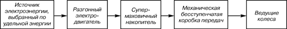 Рис. 2. Схема электромобиля новой концепции Принципиальным отличием данной концепции электромобиля от других гибридных схем является отбор мощности от источника электроэнергии необратимой электромашиной – специализированным разгонным электродвигателем малой мощности, соответствующей эффективной удельной мощности источника электроэнергии. Для упомянутых выше легкового электромобиля и электробуса это соответствует 15 и 20кВт. Благодаря высокой частоте вращения разгонного электродвигателя – до 35000об/мин для легкового электромобиля и 25000об/мин для электробуса, что соответствует частоте вращения разгоняемых супермаховиков для накопителей этих машин, масса их весьма мала, соответственно 15 и 30кг (это обычные показатели для отечественных конструкций авиационного назначения). Источник энергии и разгонный электродвигатель могут быть объединены в один энергетический блок, сходный по массе и габаритам с демонтируемым с шасси двигателем и его системами. Топливный бак и система питания в принципе могут быть сохранены с добавлением конвертора для получения водорода из топлива. Таким образом, в энергетическом блоке химическая энергия топлива преобразуется в механическую в виде вращения вала, совершенно так же, как и у теплового двигателя. Функцию сцепления выполняет выключатель, подключающий электромотор к источнику энергии. Таким образом, по желанию заказчика в двигательный отсек может быть установлен любой преобразователь химической энергии топлива в механическую – тепловой двигатель или новый энергетический блок. Далее все, как и в обычном автомобиле, вал энергетического блока соединяется с коробкой передач, в данном случае бесступенчатой. Такая коробка передач уже в недалеком будущем заменит менее эффективные ступенчатые даже на обычных автомобилях. В результате мы получаем электромобиль новой концепции в максимальной степени унифицированный с обычным автомобилем. Каковы же преимущества электромобиля новой концепции? По сравнению с автомобилем это несравненно более высокая эффективность использования топлива и экологическая безопасность. По сравнению со средним КПД преобразования химической энергии в механическую – порядка 10...15% у тепловых двигателей на автомобилях (не следует путать с КПД тепловых двигателей на оптимальном режиме – 30% у бензиновых двигателей и 40% у дизельных), этот КПД у топливных элементов с конвертором – 50%, а у кислородно-водородных топливных элементов – 70%. Вредные выхлопы у топливных элементов практически отсутствуют. Примерно такие же преимущества у электромобилей новой концепции по сравнению с аккумуляторными электромобилями, с той разницей, что вредные выбросы последних имеют место не на самой машине, а на электростанциях. По сравнению с наиболее передовыми конструкциями гибридных систем электромобилей с топливными элементами и маховичными накопителями, например, схемой предложенной и осуществленной фирмой "BMW", преимуществом новой концепции является меньшие габаритно-массовые показатели и высший КПД электромашины. Это обусловлено тем, что в новой концепции электромашина не универсальная, обратимая, а узко специализированная, разгонная, загруженная практически постоянной мощностью, почти на порядок меньше максимальной и при высоких частотах вращения. Второе преиму