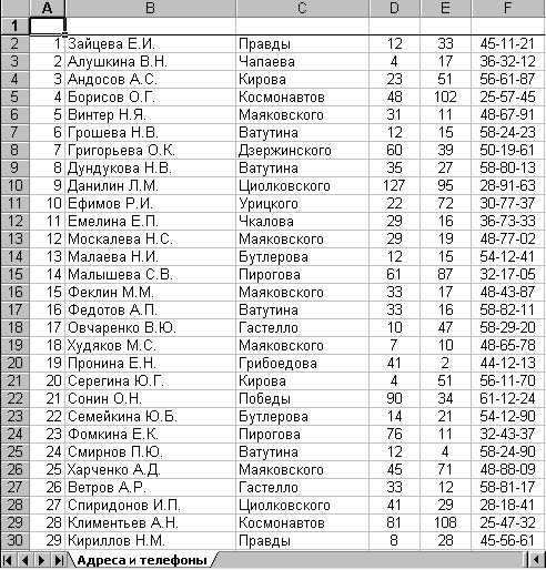 2. Щелкнуть кнопку . Упражнение 5. Поместить столбцы № и Ф.И.О. за столбцом Телефон. Отсортировать столбцы базы данных базы данных в соответствии с пользовательским списком в порядке возрастания, затем убывания. 1. Выделить ячейки А1:В30. 2. Перенести блок ячеек А1:В30 за столбец Телефон. 3. Выделить ячейки С1:H30. 4. Перенести блок ячеек С1:H30 по адресу А1:G30. 5.