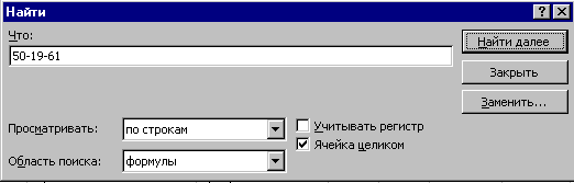 Выбрать элемент Ватутина. В результате должно остаться две записи. Упражнение 10. Найти ячейку с содержимым «50-19-61». 1. Выделить первую ячейку рабочего листа. 2. Выбрать в меню Правка команду Найти. Появится диалоговое окно Найти. 3. Ввести в поле Что: образец поиска: 50-19-61. 4. Установить флажок проверки Ячейка целиком. 5. Выбрать в раскрывающемся списке Просматривать элемент По строкам. 6.