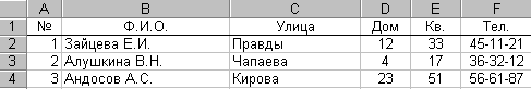 Выбрать в меню Данные команду Сортировка. Появится диалоговое окно Сортировка. 6. Щелкнуть кнопку Параметры...Появится окно Параметры сортировки. 7. Выбрать в раскрывающемся списке Сортировка по первому ключу: пользовательский порядок сортировки: №, Ф.И.О., Улица, Дом, Кв., Телефон. 8. Установить в поле Сортировать флажок опции столбцы диапазона. 9. Щелкнуть кнопку ОК в окне Параметры сортировки. 10. Выбрать в раскрывающемся списке поля Сортировать по Строка 1. 11. Выбрать в поле Сортировать по возрастанию. 12. Щелкнуть кнопку ОК в окне Сортировка диапазона. 13. Обратить внимание, как упорядочилась база данных. 14. Выбрать в поле Сортировать по убыванию. 15. Обратить внимание, как изменился порядок базы данных. Упражнение 6. Добавить новую запись в базу данных, содержащую следующие поля: 30, Скоморовская И. Н., Чкалова, 13, 56, 36-71-39. 1. Выбрать в меню Данные команду Форма. 2. Щелкнуть в диалоговом окне Адреса и телефоны кнопку Добавить. Появится запись. 3. Щелкнуть левой кнопкой мыши в поле № и ввести значение – 30. 4. Аналогичным образом ввести остальные поля новой записи. 5. Нажать клавишу Enter для добавления записи в базу данных. 6.
