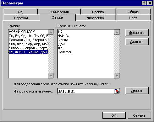 Рассмотрим целостную обработку данных таблицы на примере. Упражнение 1. Создать пользовательский список: №, Ф.И.О., Улица, Дом, Кв., Тел. Ввести этот список в первую строку рабочего листа, используя автозаполнение. 1. Открыть меню Сервис. 2. Выбрать команду Параметры. 3. Выбрать вкладку Списки. 4. Выбрать в списке Списки элемент НОВЫЙ СПИСОК. 5. Ввести в поле Элементы списка первый элемент - № и нажать клавишу Enter. 6. Аналогично ввести остальные элементы списка. 7. Щелкнуть кнопку Добавить. Созданный пользовательский список появится в поле Списки. 8. Щелкнуть кнопку ОК. 9. Ввести в ячейку А1 первый элемент списка №. 10.