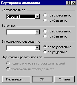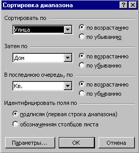 Щелкнуть ОК. Упражнение 3. Отсортировать базу данных в алфавитном порядке по столбцу Улица, а затем по столбцу Дом и по столбцу Кв. 1. Выделить любую ячейку. 2. Выбрать в меню Данные команду Сортировка. Появится диалоговое окно Сортировка. 3. Установить в группе Идентифицировать поля по флажок опции подписям. 4. Выбрать в раскрывающемся списке поля Сортировать по столбец, по которому нужно сортировать данные, - Улица. 5. Установить в поле Сортировать по флажок опции По возрастанию для сортировки по алфавиту. 6. Выбрать в раскрывающемся списке поля Затем по дополнительный столбец – Дом. 7. Установить в этом поле флажок опции По возрастанию. 8. Выбрать в раскрывающемся списке поля В последнюю очередь, по элемент – Кв. 9. Установить в этом поле флажок опции По возрастанию. 10.