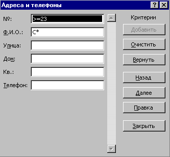 Щелкнуть кнопку Закрыть и убедится, что новая запись добавлена в конец базы данных. Упражнение 7. Найти все записи, номер которых не меньше 23, а фамилия начинается с буквы С. 1. Вызвать диалоговое окно формы. 2. Щелкнуть кнопку Критерии. 3. Ввести в поле № критерий поиска: >=23. 4. Ввести в поле Ф.И.О. шаблон: С*. 5. Щелкнуть кнопку Далее. В диалоговом окне выведена первая запись, удовлетворяющая введенным критериям. В правом верхнем углу диалогового окна Адреса и телефоны отобразится порядковый номер найденной записи в списке. 6. Повторяйте предыдущее действие до тех пор, пока не будет выведена последняя запись, удовлетворяющая критериям. После щелчка по кнопке Далее будет слышен звуковой сигнал, и содержимое окна формы не будет меняться. 7.