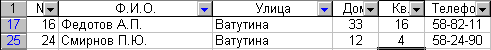 Прейдите к первой записи, удовлетворяющей введенным критериям, используя кнопку Назад. Упражнение 8. Заменить в записи о Ветрове А.Р. номер телефона с 58-81-17 на 58-77-11. 1. Найти запись о Ветрове А.Р., используя поиск по критерию. 2. Щелкнуть левой кнопкой мыши в поле Тел. 3. Удалить номер телефона и ввести новый – 58-77-11. 4. Закрыть окно формы, щелкнув Закрыть. Упражнение 9. Вывести на экран список лиц, которые живут на улице Ватутина и фамилии которых начинаются на букву С или Ф. 1. Выделить дну из ячеек списка. 2. Выбрать в меню Данные команду Фильтр. 3. В подменю выбрать пункт Автофильтр. 4. Открыть раскрывающийся список в столбце Ф.И.О. 5. Выбрать элемент Условие. Появится диалоговое окно Пользовательский автофильтр. 6. Выбрать в левом верхнем раскрывающемся списке оператор равно. 7. Ввести в левом верхнем раскрывающемся списке шаблон С* для отбора записей о лицах, фамилии которых начинаются с буквы С. 8. Выбрать флажок опции ИЛИ. 9. Выбрать в левом нижнем раскрывающемся списке оператор равно. 10. Ввести в правом нижнем раскрывающемся списке шаблон Ф* для отбора записей о лицах, фамилии которых начинаются с буквы Ф. 11. Щелкнуть кнопку ОК. В результате будет выведен отфильтрованный список, содержащий записи только о людях, фамилии которых удовлетворяют критерию. 12. Открыть раскрывающийся список в столбце Улица. 13.